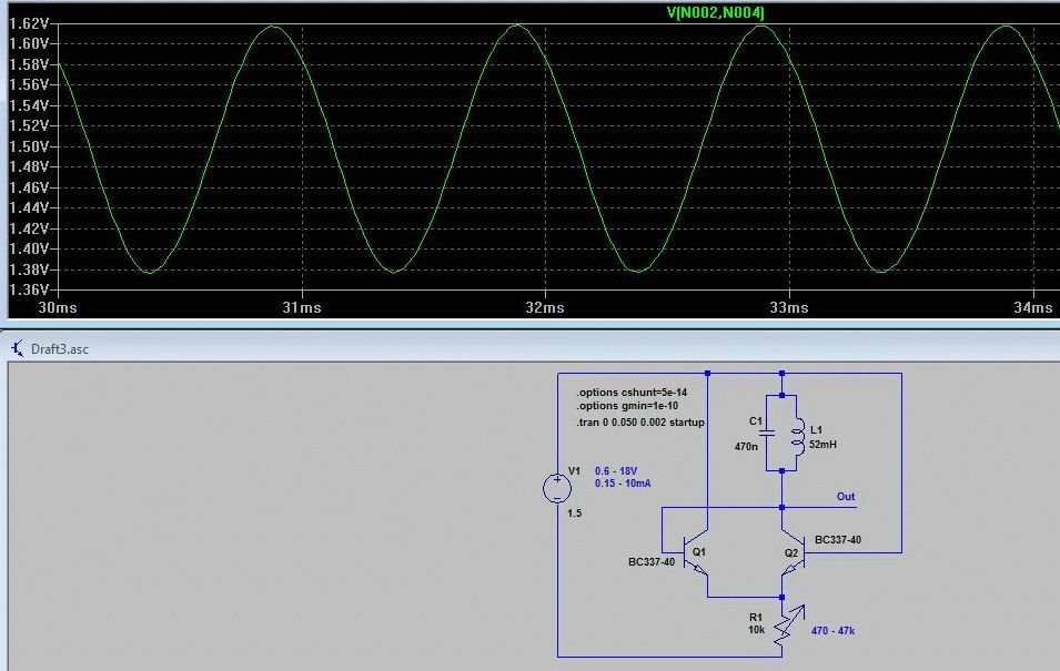 Weiß jemand wie dieser Generatortyp heißt? Läuft erstaunlich stabil von 0.6V bis ....V, man muß nur R1 anpassen. Strom je nach Konfiguration bzw. Einstellung von ca. 150µA -> einige mA. Hab Frequenzen von ca. 3Hz (kleiner Netztrafo als Spule) bis zu 24MHz damit erzeugt. Bei 24MHz war nur noch eine Meßstrippe (ca. 30cm lang) an Stelle des Schwingkreises. Mit ein wenig rumspielen an Spannung und Poti_R1 schwang er bei 24 MHz.