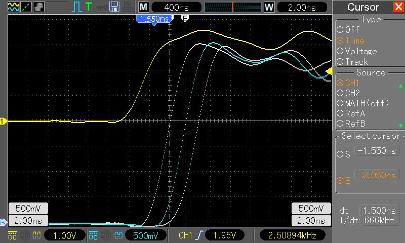 Bei 2 ns Zeitablenkung wird m.W. die Speichertiefe auf 40 k limitiert. Eine Flanke die sich 20 ns vom -90% zum 90% aufschwingt. Das sieht eher nach 50 MHz Bandbreite aus. Anbei mal ein Bild von einem DSO-3062C *) das einen TI Piccolo beim Erzeugen einer HRPWM zeigt. Zwischen den Referenzkurven und der aktuellen Messkurve liegen je 10 Steps des Incrementregisters (a 150 ps). Vielleicht kann ein anderer geneigter Kaffeesatzleser daraus mal die Bandbreite herauslesen... :-) Besorg Dir mal was, was ein bisschen flankensteiler ist. *) Mit Patch und den originalen TK. (Die PP-200 kamen erst spaeter.)