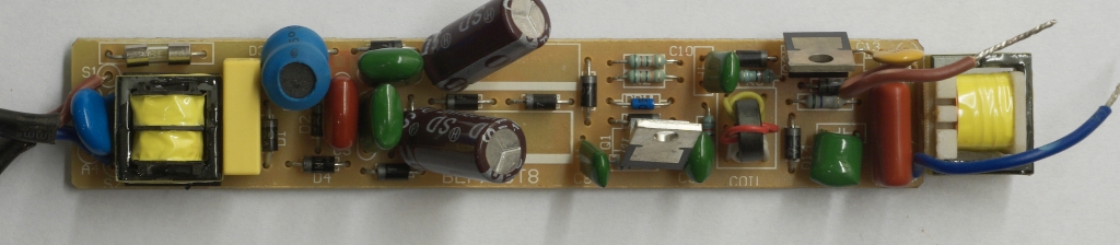 So Männers, ich war heute noch im Baumarkt, brauchte Schrauben. Nein, nicht im B1, der ist (in Berlin) pleite. Natürlich auch noch zur Lampenabteilung gepilgert und dort, wie üblich, palettenweise Billigfunzeln. Mit LED für 19,xx und mit T8 für 4,99 Euronen. Optisch genau die gleichen wie meine, also zum Test eine gekauft. Der Aufbau ist exakt gleich (Metallprofil und eingeklipste Elektronik) und die Schaltung ist fast gleich, nur im Deteil offenbar etwas anders. Zumindest sind 4 Transistoren verbaut, ich vermute 2 Treiber für den Gegentaktwandler. PTC ist nicht zu sehen, Die Heizwendeln werden direkt über einen C (auch 8,2nF) verbunden. Die Elkos haben hier vernünftigerweise 350V, ob die in der Schaltung dort anliegen, weis ich nicht. Das Ding werde ich mal anklöppeln, schaun wir mal was passiert. Old-Papa