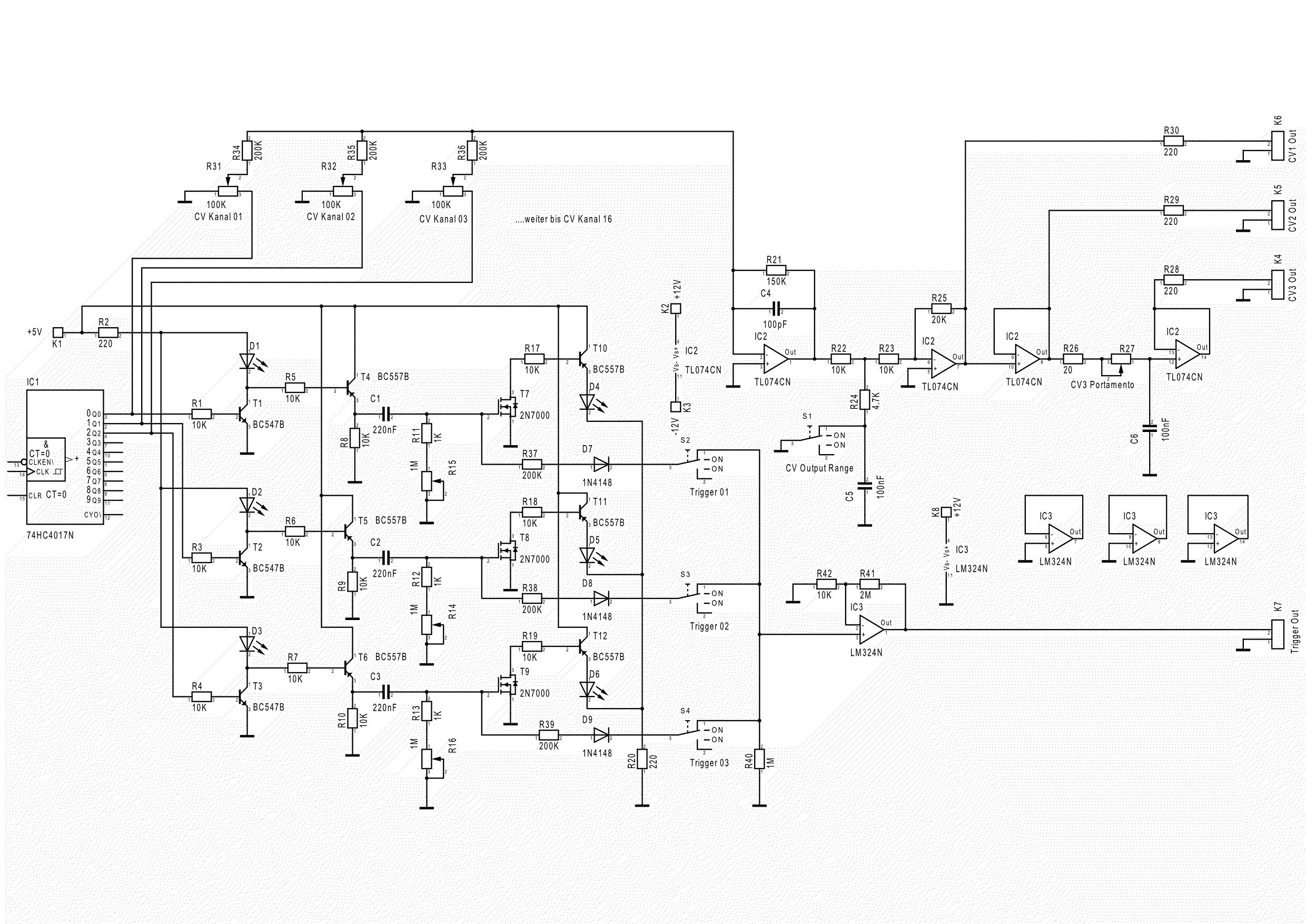 Hallo Michael Vielen Dank für deinen Einsatz! Zur Schaltung an sich: Ich möchte damit ein modularer Synthesizer befeuern. Deshalb macht es auch Sinn, mehrere unabhängige CV Ausgänge zu haben um verschiedene Module anzusteuern (zB. Pitch, Filter-CutOff). Die Gate-Signale sollen wärend der ganzen Impulsdauer ein Spannungssignal von Einstellbar 0-5V liefern beziehungsweise im Low-Range bereich von ca. 0-2V. Das ganze hat eigentlich im Versuchsaufbau ganz gut funktioniert. Zur variablen Impulsdauer: Ich möchte mit den unterschiedlichen Impulslängen zB. den VCA ansteuern um ein: Tüüü, Tüüü, Tü, Tü, Tüüüüüüüü, Tüüüüüü, Tü zu erhalten. Diese Impulslängen möchte ich gerne mit LED`s pro Kanla visualisieren. Hoffe es ist verständlich! ;-) Als Clockeingang möchte ich den Triggerausgang eines Clockmoduls verwenden. Das ist jeweils nur eine kleine Impulsdauer (auf dem Oszilloskop kaum sichtbar zu machen, da so kurz).