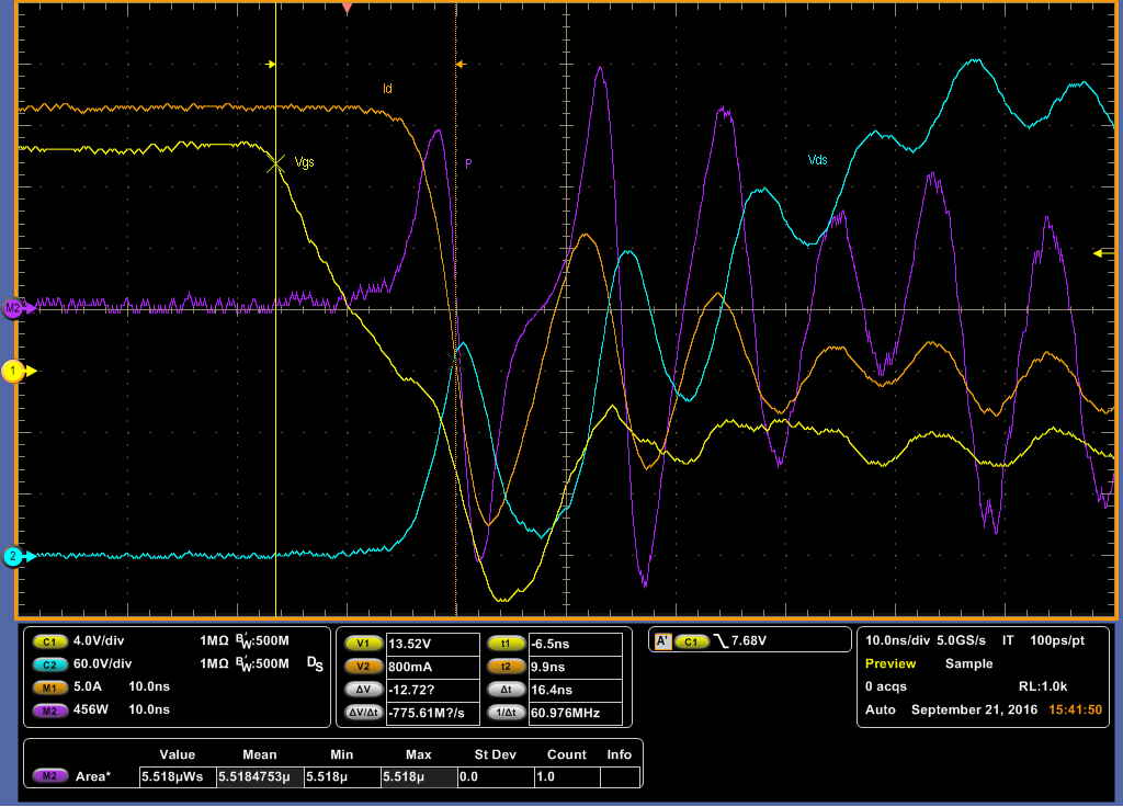 Hi nein natürlich nicht mit 1ns, die werte aus dem ltspice modell sind auf dem screenshot noch etwas zu hoch sry. Habe in real eine tfall beim einschalten der bodydiode des unteren schalters von ca. ~5ns 360 auf 40 V beim harten einschalten td 4,55ns und tfall 7,9 (Induktivität parallel zum oberen schalter. wie beim doppelpulstest üblich. beim ausschalten aus dem bild ist td= 12,8 ns und trise 31,75 ns