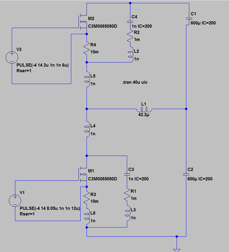 Hallo, ich hab mir nen Testaufbau für 2 MOSFETS in H Konfiguration gemacht, für z.B. einen Tiefsetzsteller. Der untere Schalter schaltet bei null Volt ein ZVS. Und zur Ausschaltentlastung wollte ich mal ein Kondensator parallelschalten. Im netz hab ich dann folgende Berechnung gefunden für RCD Netzwerke. Also C = Isw * tfi / 2*Uds um den Effekt besser zu sehen habe ich mal eine größere Kapazität genommen als eigentlich nötig, ich weiß beim einschalten verursacht diese zusätzliche verluste aber beim ausschalten sollte sie den schalter noch mehr entlasten. (ist ja nur ein versuch) http://aboutme.samexent.com/classes/spring09/ee5741/Snubbers.pdf seite 11 Jetzt hab ich das Problem dass beim Ausschalten die Spannung und der Strom stark Schwingen und die Verluste nach dem Schalten kurzeitig bis zum einschwingen viel größer sind als zum Schalten. Jemand eine idee wo ich was falsch mache ? liegt es an der parasitären Kondensatorinduktivität? Ich finde dazu iwie auch keine vergleichsfälle ... Gatespannung +15 / -4 V Rg ext ist 2,7 ohm Die geschaltete Induktivität hat 43uH U=400V I=20A Schaltungsanordnung im Bild Schalter: Cree C3M0065090J SiC MOSFET Danke schonmal für jeden Denkanstoß