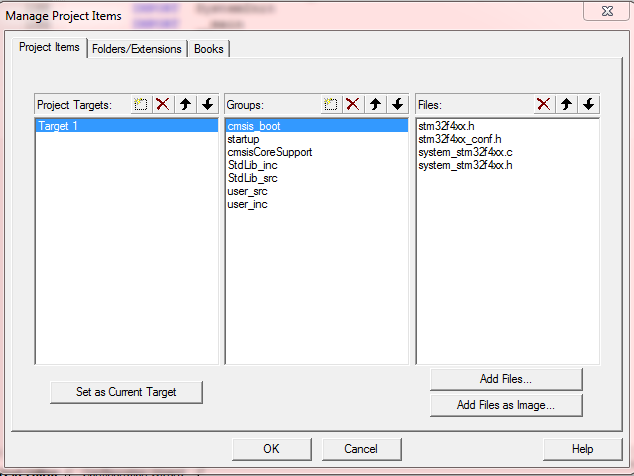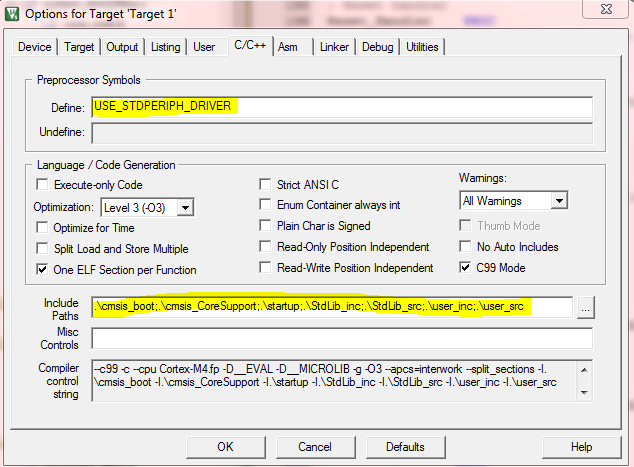 Hallo zusammen, ich möchte mir ein Basisprojekt für den STM32F030 in Keil µVision 4 anlegen und zwar mit den Standardbibliotheken von ST. Wenn ich nun aber z.B. die GPIO-Lib einbinden will, dann kommt folgende Fehlermeldung: fatal error 'stm32f0xx_gpio.h' file not found Zu meinem Vorgehen: 1) Bibliotheken von ST gedownloadet 2) (In dem Dialogfester links) die .h und .c Datei für die GPIOs in die Projektstruktur eingebunden 3) Bei den Einstellungen/C/C++/Prepocessor Symbols/Define "USE_STDPERIPH_DRIVER" eingegeben 4) Bei den Einstellungen/C/C++/Include Paths den Downloadpfad der Bibliotheken von ST eingebunden Wieso kann er die Datei trotzdem nicht finden? Muss ich noch was anderes einstellen oder habe ich etwas falsch gemacht?