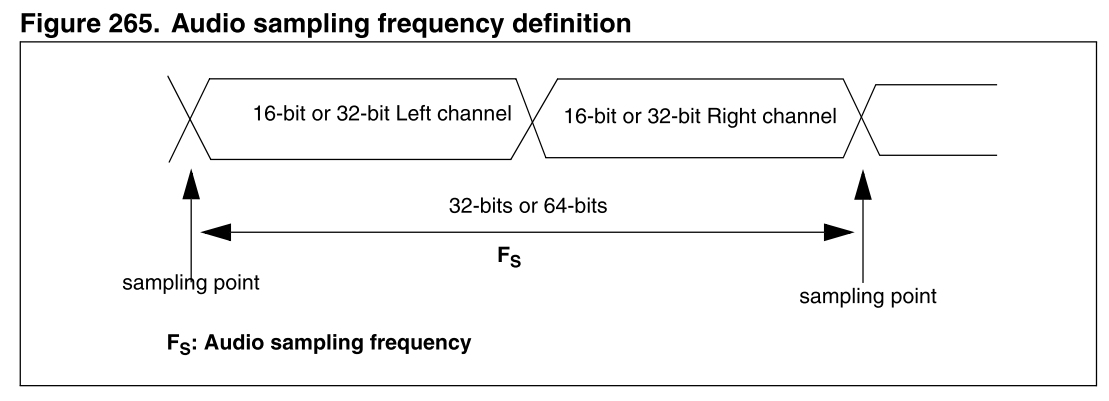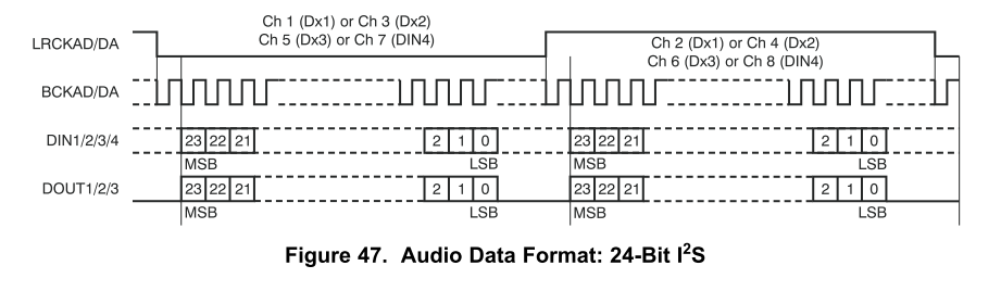Klaus schrieb: > Und zwar liefert der PCM 24 Bit Datenpakete bzw. 6 Byte pro > Abtastperiode (linker und rechter Kanal), siehe pcm_fig47.png [...] > > Datenlänge auch auf 24 Bit einstellen kann. Das ist schonmal gut. > hingegen (CHLEN) lässt die "number of bits per audio channel" > jedoch nur auf [..] 32 Bit [...] > Denke ich zu umständlich? Nur ein bisschen. ;-) Schaue dir Fig47 nochmal genau an. I2S überträgt pro Kanal immer erst Nutzdaten und dann ein klein wenig Dummy-Daten (gestrichelte Linie zwischen den Kanälen zeigt, da ist was weggelassen). In deinem Fall besteht ein I2S Kanal aus 24Bit Audio-Daten (Nutzdaten) und 8Bit Dummy-Daten. Insgesamt also 32Bit für einen I2S Kanal. Da immer abwechselnd 2 Kanäle (CH1 + CH2) auf einer I2S Datenleitung (DOUT1) übertragen werden ist dein I2S Frame also 2x32bit mit 2x24bit Nutzdaten.