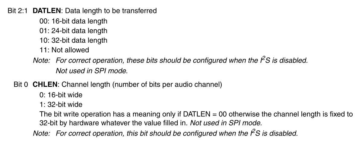 Hallo, ich möchte den AD/DA-Wandler PCM3168A in Verbindung mit einem STM32F103RET6 Mikrocontroller nutzen bzw. eine I2S-Datenverbindung zwischen beiden ICs aufbauen. Beide ICs unterstützen zwar I2S, jedoch bin ich nun über ein kleines Detail gestolpert, bei dem ich gerade nicht einordnen kann, ob die Kommunikation dann überhaupt funktionieren wird. Und zwar liefert der PCM 24 Bit Datenpakete bzw. 6 Byte pro Abtastperiode (linker und rechter Kanal), siehe pcm_fig47.png (Screenshot aus dem Datenblatt). Der Mikrocontroller hingegen arbeitet laut Fig. 265 des Reference Manuals jedoch mit entweder 16 oder 32 Bit Datenpaketen pro Kanal (stm32_fig265.png). Sieht man sich das I2S configuration register des Mikrocontrollers auf den Seiten 720 und 721 an (stm32_i2scontrolreg.png) steht dort zu den Bits 1 und 2 (DATALEN), dass man die Datenlänge auch auf 24 Bit einstellen kann. Das ist schonmal gut. Bit 0 hingegen (CHLEN) lässt die "number of bits per audio channel" jedoch nur auf 16 oder 32 Bit einstellen. Nun bin ich mir unsicher, ob die beiden Bausteine miteinander kommunizieren können... Denke ich zu umständlich? Ich würde mich freuen bzw. wäre sehr dankbar, wenn das jemand aufklären könnte. Vielen Dank für eure Hilfe!