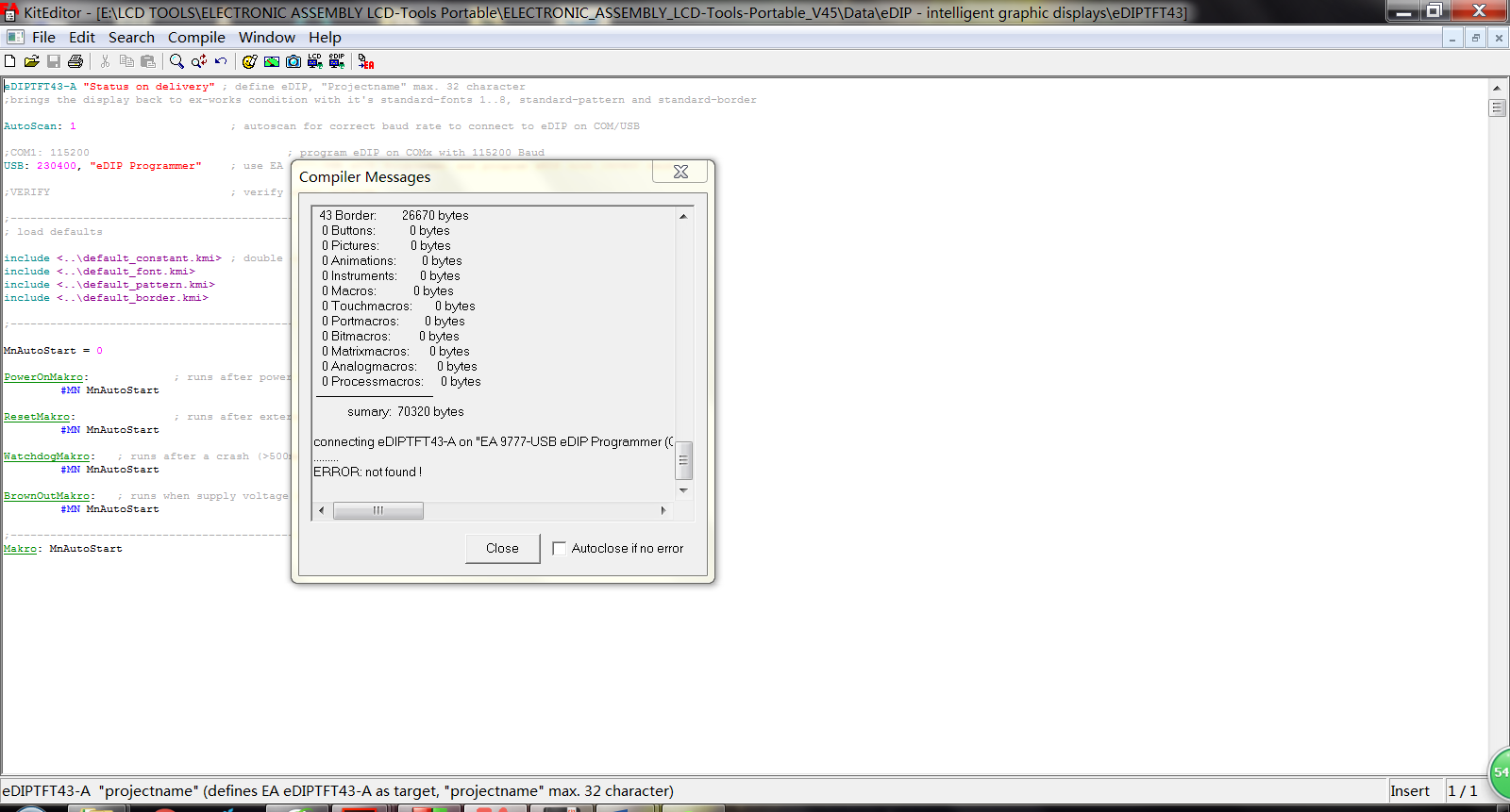 Hallo, ich habe jetzt mit EA eDIPTFT43-A benutzt. Aber when ich mit EA LCD Tools verbinde, immer hat ein Problem. ERROR: NOT FOUND. Ich habe Treiber unterladen. Aber Display immer nicht arbeiten.