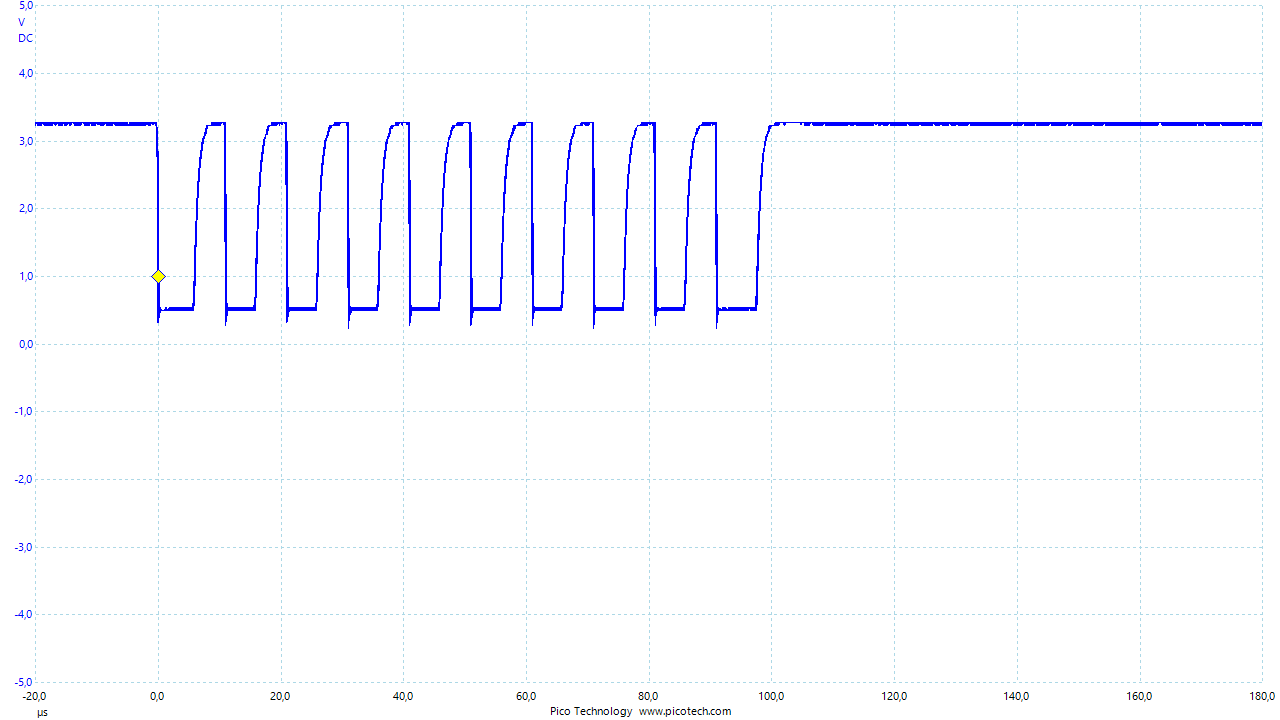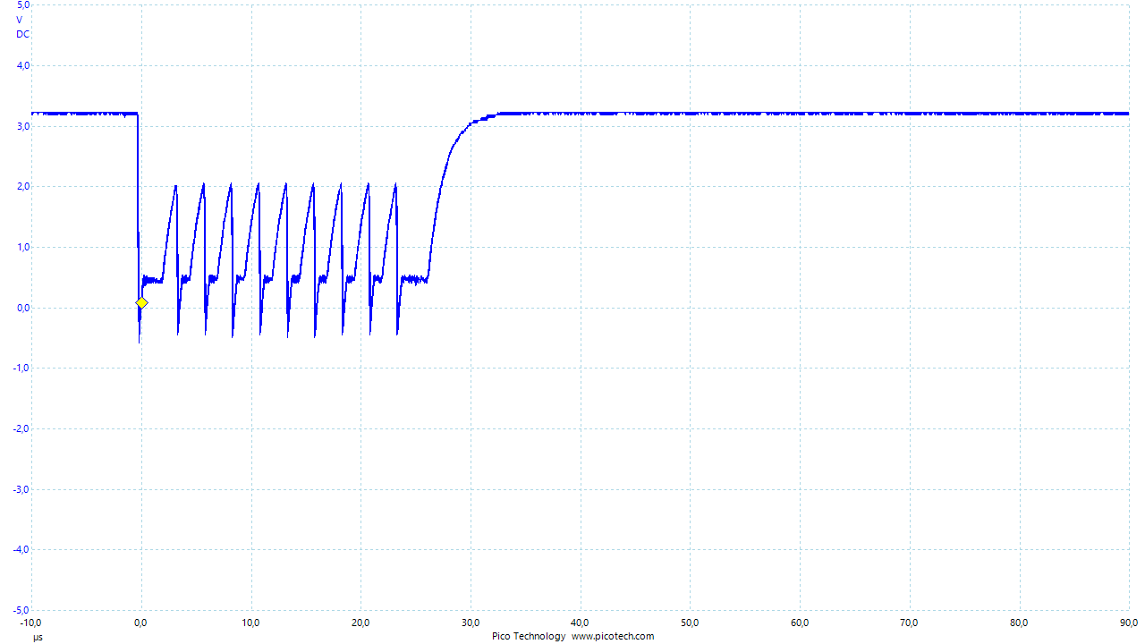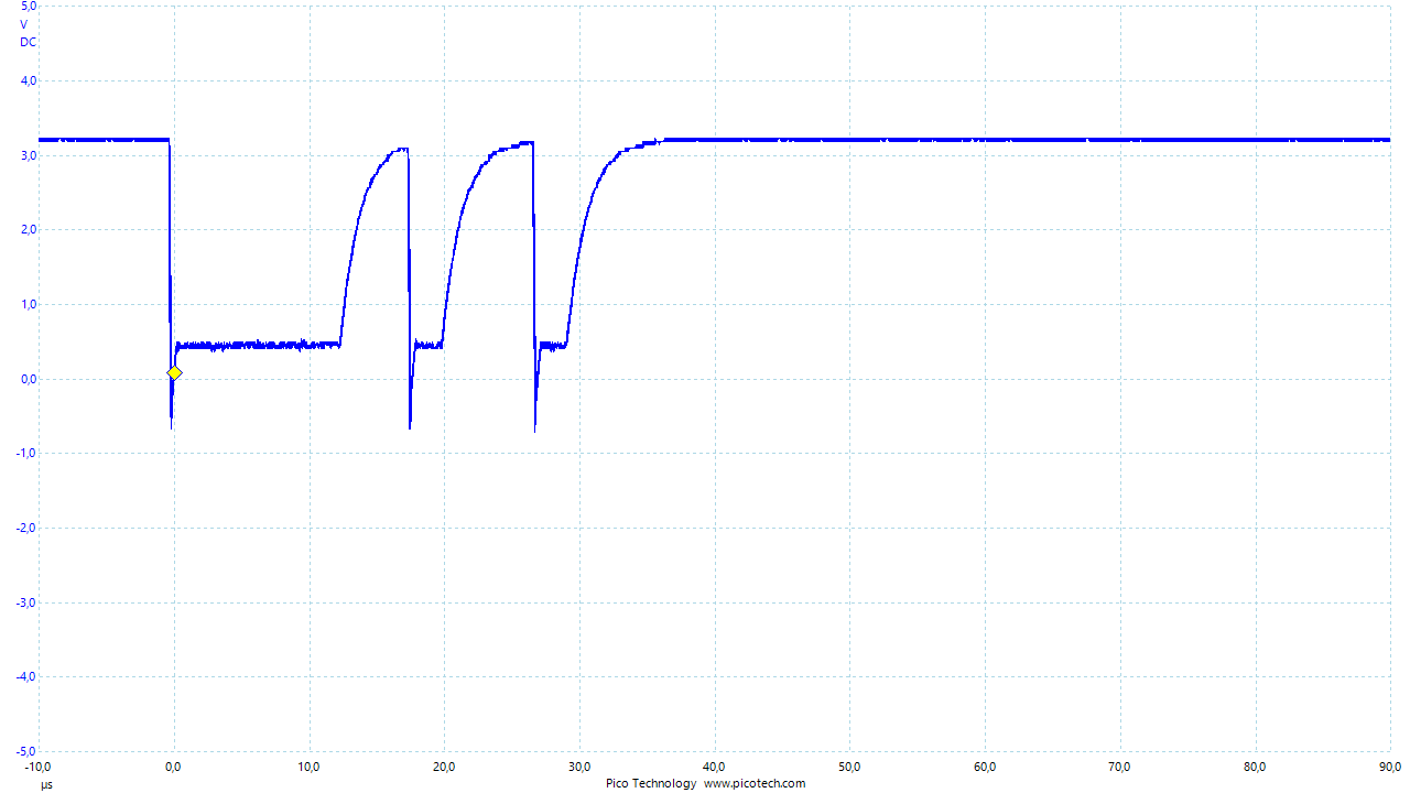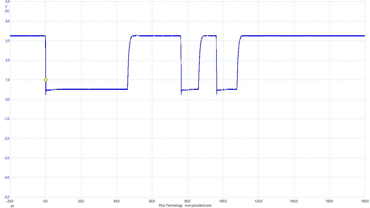 Hallo zusammen, ich verwende zur Sensorabfrage den I2C-Bus. Master ist ein Atmega328 auf 5V, die Sensoren (1x MPU6050, 2x SI1133) haben 3.3V. Level Shifter ist ein PCA9515A, welcher auch funktioniert. Pull-Up ist je ein 10k Widerstand (Fehlerquelle?). Allerdings kann ich keine Adresse der Sensoren erreichen. Und langsam verzweifle ich. Eine Idee habe ich noch. Die angehängten Verläufe sind je SDA und SCL des I2C nach dem PCA9515A, also 3.3V high. Aber ist es normal das sie so abgerundet aussehen? Könnte das vielleicht mein Problem sein? Es wirkt irgendwie als würde da ein Kondensator was glätten oder so. Oder liegt es an den Widerständen? Danke für eure Hilfe. Grüße, Niine