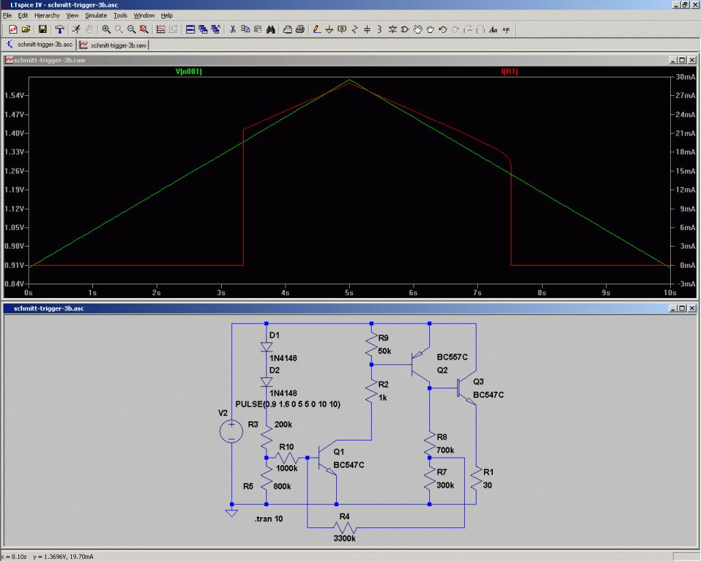 Hallihallo hallöchen, was gibts denn noch für diskrete Schmitttriggerschaltungen für UB um 1.3V, aber mit großer Hysterese und kleinem Ruhestrom? Idee: Meine Discokugel soll mittels 0.5V/20mA Getriebemotor und NiMH-Mignonzelle gedreht werden, wenn die Akkuspannung durch die parallel geklemmte Solarzelle über ca. 1.4V gestiegen ist. Dann soll der Motor laufen, bis die Spannung unter ca. 1.2V abgesunken ist (Werte verhandelbar). Geht das mit Standardbausteinen aus der Kiste? Den NPN-NPN-Standardschmitttrigger kann man bei den Anforderungen vergessen?