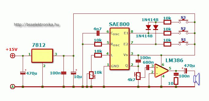 Ich bin immer noch auf der Suche nach einer Lösung. Mit dem Betrieb des SAE800 an umgekehrter Polarität konnte ich gar nichts zum laufen bringen. Ich habe es noch mit der Schaltung unten probiert. Grundsätzlich funktioeniert das, aber mit der Übergabe des Signals zwischen GND und Q aus dem SAE800 ist das Signal so schwach, dass für ein brauchbares Ausgangssignal die Verstärkung am LM386 (Gain 1/8) so erhöht werden muss, dass bei einem Betrieb an einem Netzteil am Ausgang immer ein Rauschen vorhanden ist, das ich bisher auch mit diversen Filtern (Kondenstaoren zwischen Bypass/7 und GND und parallel zu Vs/6 und GND/4) nicht in den Griff bekommen habe. Hat noch jemand einen Vorschlag für mich? Danke!