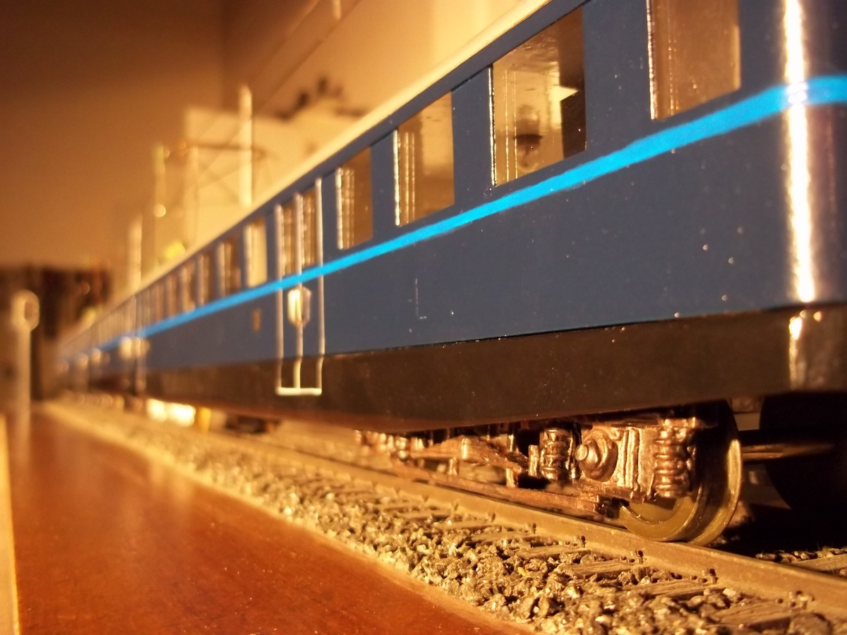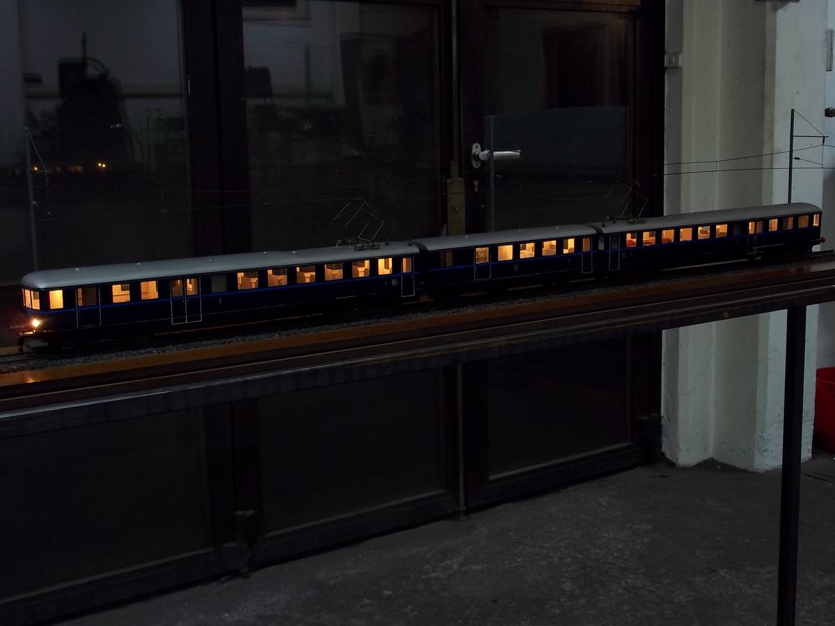 Da habe ich noch ein zweites Projekt, das ich auch mal beenden will. Ein Modell eines Triebwagens ( Spur 0 ) , entstanden um 1950. Ein Volldepp hat die Drehgestelle entfernt und hat geglaubt, er könnte das Teil auf seiner Modellbahn verwenden. Das funktioniert nicht. Das Modell ist maßstabsgerecht, und würde vieleicht durch einen 4 Meter Radius passen. Es war offensichtlich auch nie als Modellbahn gedacht, Lötspuren am Unterboden weisen eindeutig darauf hin, dass dies immer als Standmodell gedacht war. Aber: Die originalen Drehgestelle sind halt weg. Machen: Form aus Balsa und Fundstücken.( Achslager aus Knopfzellen!) Abformen mit Hochtemperatur- Silikon (Baumarkt). Ausgießen mit Bleilot. Ergebniss: siehe Bild P.S. Was micht etwas nervt, das Teil hat ca.30 Glühbirnchen, ( E 5,5 12 V), die fallen oft aus, aber nicht weil sie defekt sind, sonder anscheinend kriecht das Zinn des zentralen Lötpunktes. LEDs sind keine Lösung, gibt es bessere Glühbirnchen? Grüße Bernd