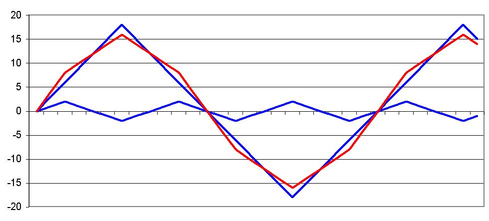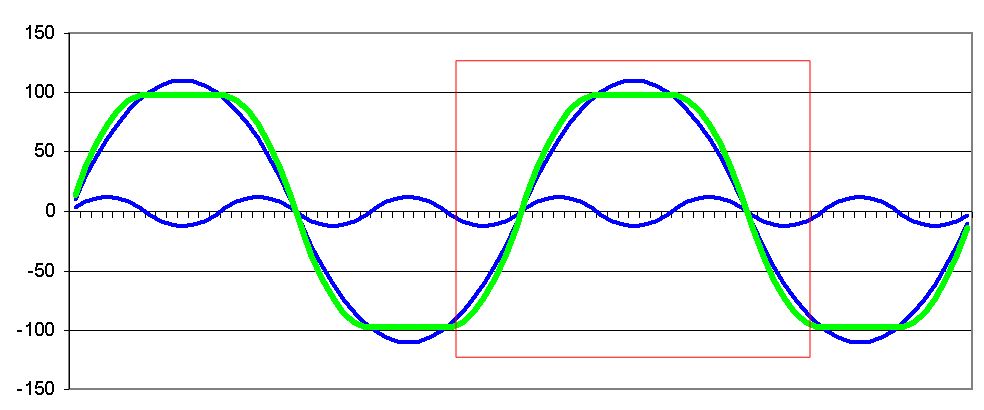 Um jetzt wieder zum rein Analogen zu kommen und noch auf die Idee mit den Dioden einzugehen: An der oben geposteten Grafik rechts kann man sehr schon sehen, warum durch das Clippen mit Dioden in der Frequenzbetrachtung plötzlich eine dritte Oberwelle "entsteht". Die Dioden liefern aber nicht den Anstieg des Dreiecks während der steigenden Phase des Dreiecks, der benötigt wird, um es bauchiger zu machen. In der Grafik oben rechts ist die dritte OW addiert, um das Signal spitzer zu machen. Es ist einsichtig, dass sie für die Bildung des Sinus abgezogen werden muss, was das Minus in der Fourierreihe erklärt.