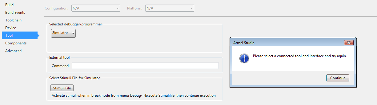 Ich wollte ein kleines Testprogramm im Atmel Studio 7 simulieren - beim ersten Versuch hat das auch prima geklappt, aber bei jedem weiteren F11 poppt ein Fenster auf und das Studio öffnet Test Properties | Tools und will eine Eingabe - nur welche?