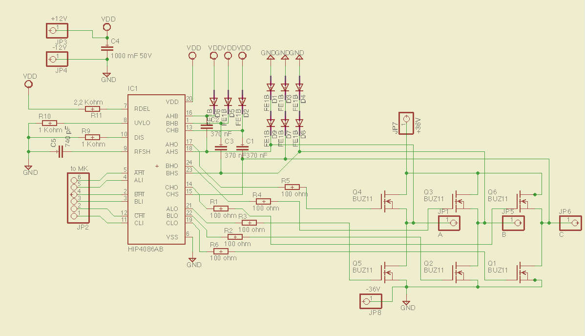 Hallo zusammen! Entschuldigung für meine Deutsch, aber Englische Seite nicht aktive ist wie hier. Ich möchte eine BLDC Controller entwickeln mit arduino und HIP4086 3-Phase Bridge Driver. Ich habe das Schaltplan gemacht, aber er arbeitest nicht. Ich kann nicht das Problem herauszufinden. Könnte jemandem das Schaltplan überprüfen, vielleicht habe ich eine Fehler gemacht. Das MOSFET ist STP75NF75FP http://www.st.com/content/ccc/resource/technical/document/datasheet/99/6b/cd/5a/84/8f/44/0c/CD00002771.pdf/files/CD00002771.pdf/jcr:content/translations/en.CD00002771.pdf , auf dem Schaltplan ist andere nur für Bestimmung. Vielen Dank für Ihre Hilfe!