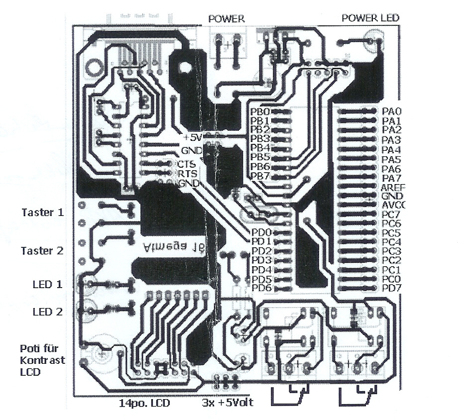 Danke für eure antworten ja widerstände habe ich jede menge, habe mal bei reichelt je 10 von einer menge verschiedener bestellt, aber obs hochlast sind weiß ich nicht, kann ich ja einfach mitbestellen... die kosten ja dann auch nicht mehr die welt... ok, werde dann den keramikkondensator verwenden im anhang findet ihr mein boardlayout, mehr habe ich zu dem bord nicht bekommen, ist halt nen gebrauchtes von ebay, funktionert aber astrein.... vielleicht kennt ihr ja weitere resources zu dem board... also kann ich doch einfach sehen, dass ich einen port frei habe und dann gehe ich daran mit den 3 pins die ich dafür brauche richtig ?? und was ist das fürn UREFL ?? den jumper kann ich mir ja einfach selber basteln aus nen paar pins ...
