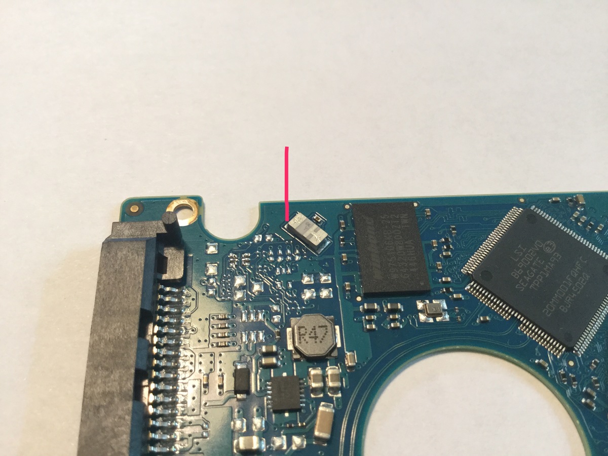 Hallo Forum, Ich versuche das im Bild markierte Bauteil einer Festplattenplatine zu identifizieren. Könnt Ihr mir dabei behilflich sein ? Kurze Fehlerbescheribung: Die Festplatte wird nicht mehr erkannt und die Platte läuft nicht mehr an (dreht nicht mehr). Vermutlich hat ein Netzteil eines externen Gehäuses die Spannungsversorgung der Platine abgeschossen. Das Bauteil gibt es noch ein weiteres Mal auf der Platine und lässt Durchgang messen - beim defekten nicht. Vielen Dank vorab für eure Mühen.
