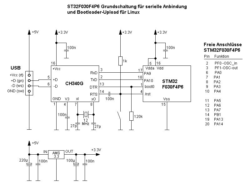 Ich bastle mir gerade eine extreme Billiglösung für ein ARM Board mit einem Bootloadermechanismus ähnlich dem Arduino Gedöns. Die Hardware ist denkbar einfach (und ultrabillig, weil nur China): - AMS1114 3.3V Spannungsregler - CH340G RS232-USB - STM32F030F4P6 Somit kann ich mir beim Aufbau einer Schaltung den ST-Link "sparen". Hardware funktioniert und auch das Flashen unter Linux funktioniert. Weil mein Porteuslinux die "Geschichte" mit /sys/class/gpio/export nicht mag hab ich die Source von stm32flash "quick and dirty" erweitert, damit bei einem Upload zuvor der Bootloadermodus des STM32 eingeschaltet wird. Wie gesagt: funktioniert ! Nun wollte ich dasselbe auch unter Windows können (damit ich die Schaltung an befreundete Windowsnutzer weitergeben kann), und wie befürchtet bekomme ich Schwierigkeiten, stm32flash auf Windows zu portieren. Grundsätzlich bin ich in der Lage, wenn der Bootloadermodus von Hand über Taster gesetzt wird, den STM32 auch unter Windows zu flashen. Nur mag ich eben genau einen weiteren Taster für boot0 nicht haben (und nicht vor jedem Uploadvorgang auf den Controller Hand anlegen). Kennt jemand eine Source von stm32flash für Windows (hab ich lange nichts mehr am System gemacht) bei der RTS und DTR aus dem Programm setzbar ist? Ralph PS: Für alle die, die das unter Linux nachvollziehen möchten: im Anhang die Schaltung des Minimalsystems und das veränderte stm32flash (das nach einem Make-Aufruf eine Datei stm32chflash erstellt). In Linux ist der vorhandene Treiber für den CH340G Chip bzgl. Parity fehlerhaft und im Zip-File ist ein Patch, der das behebt).
