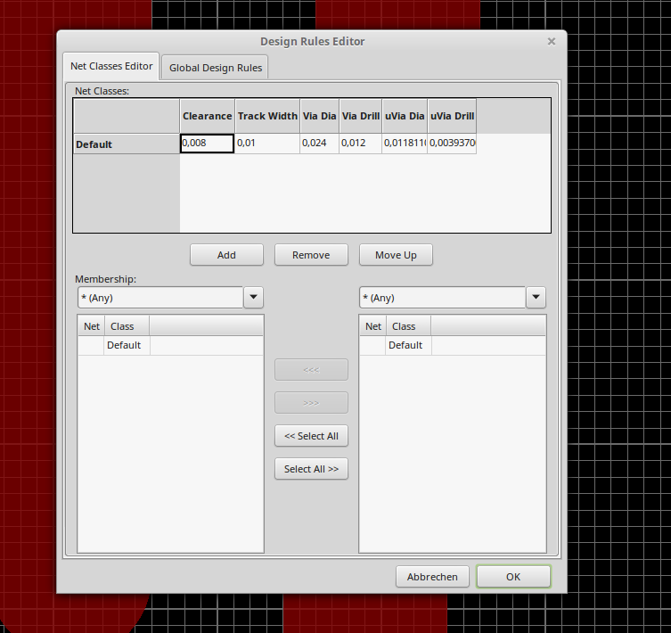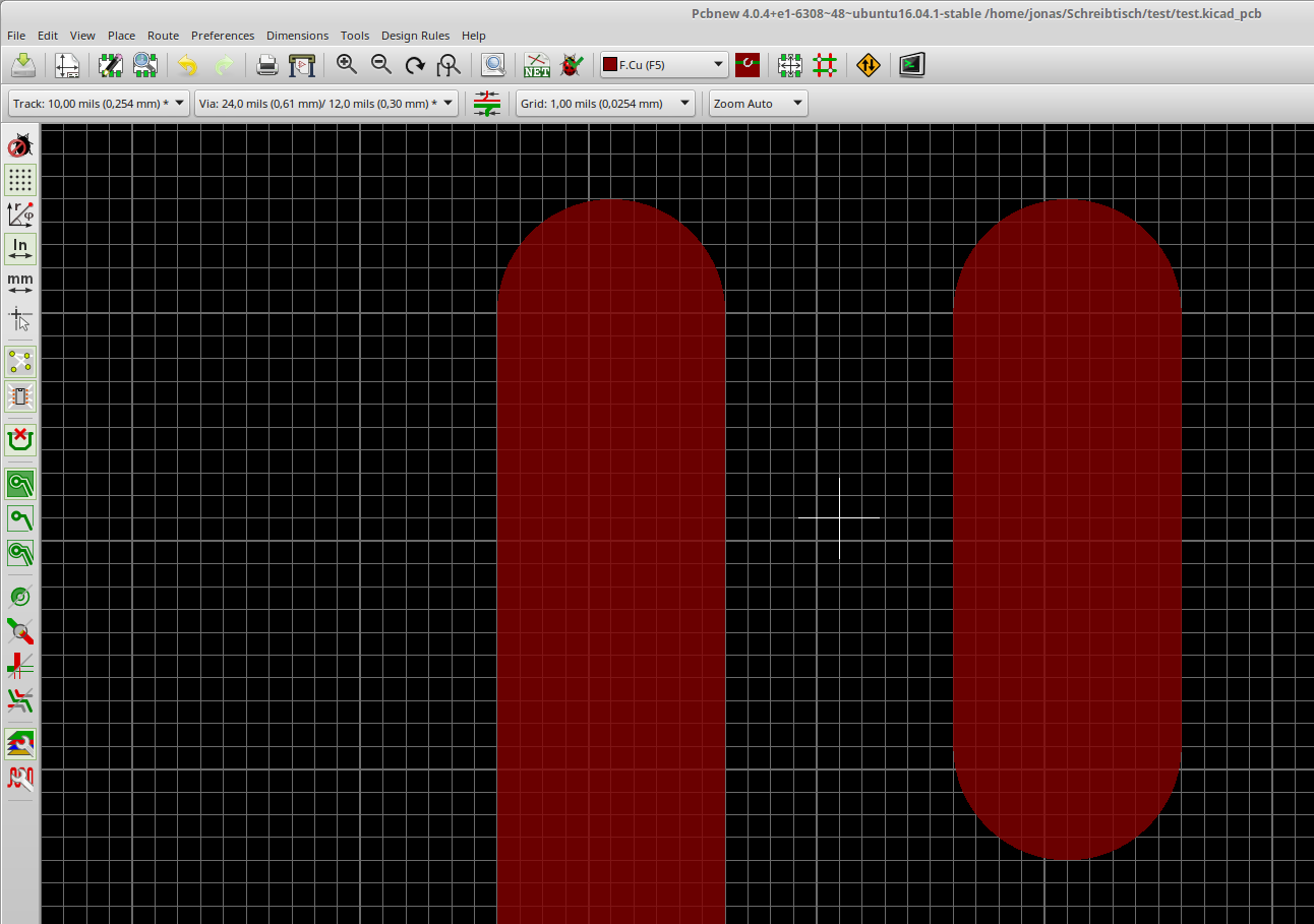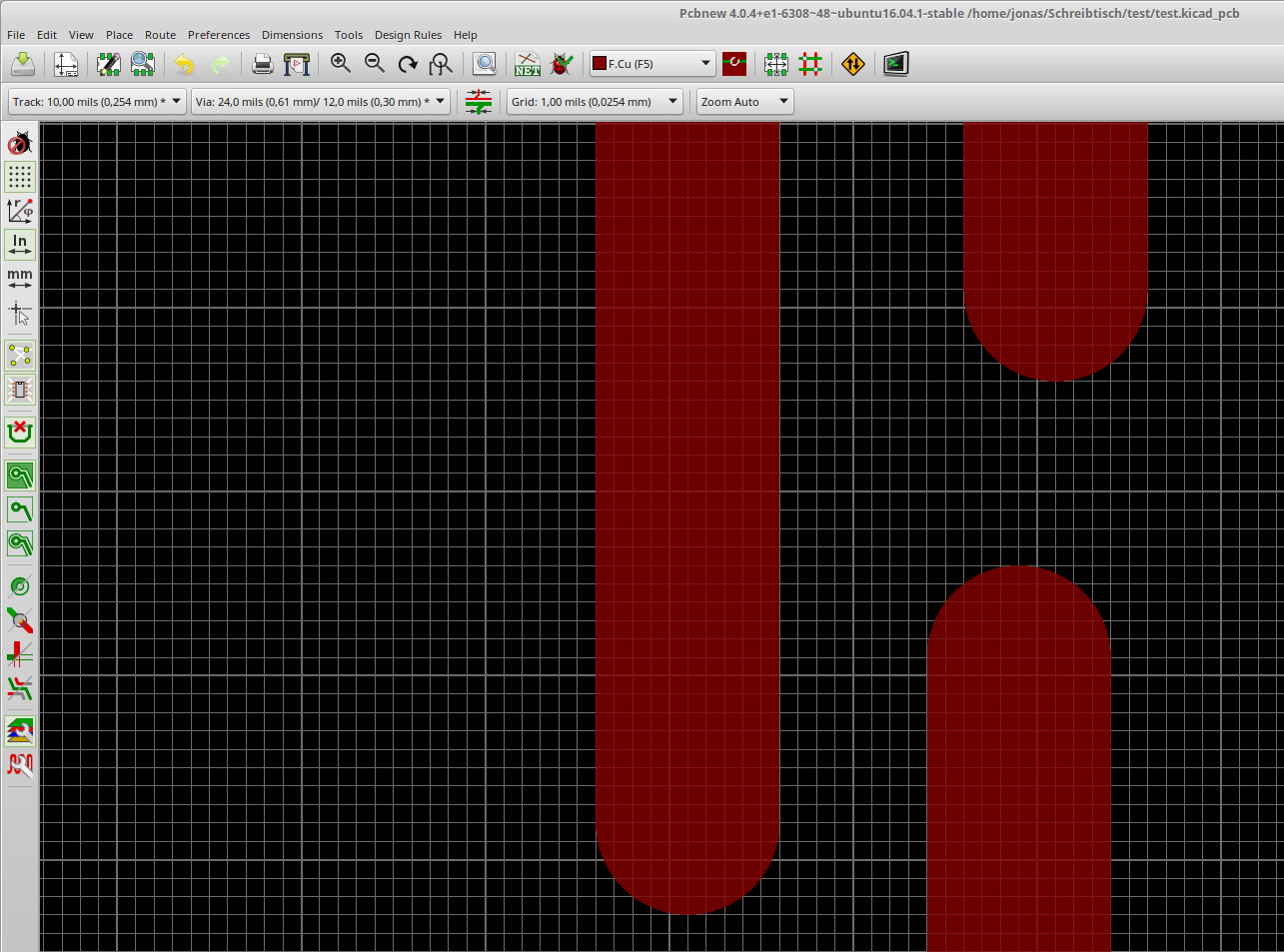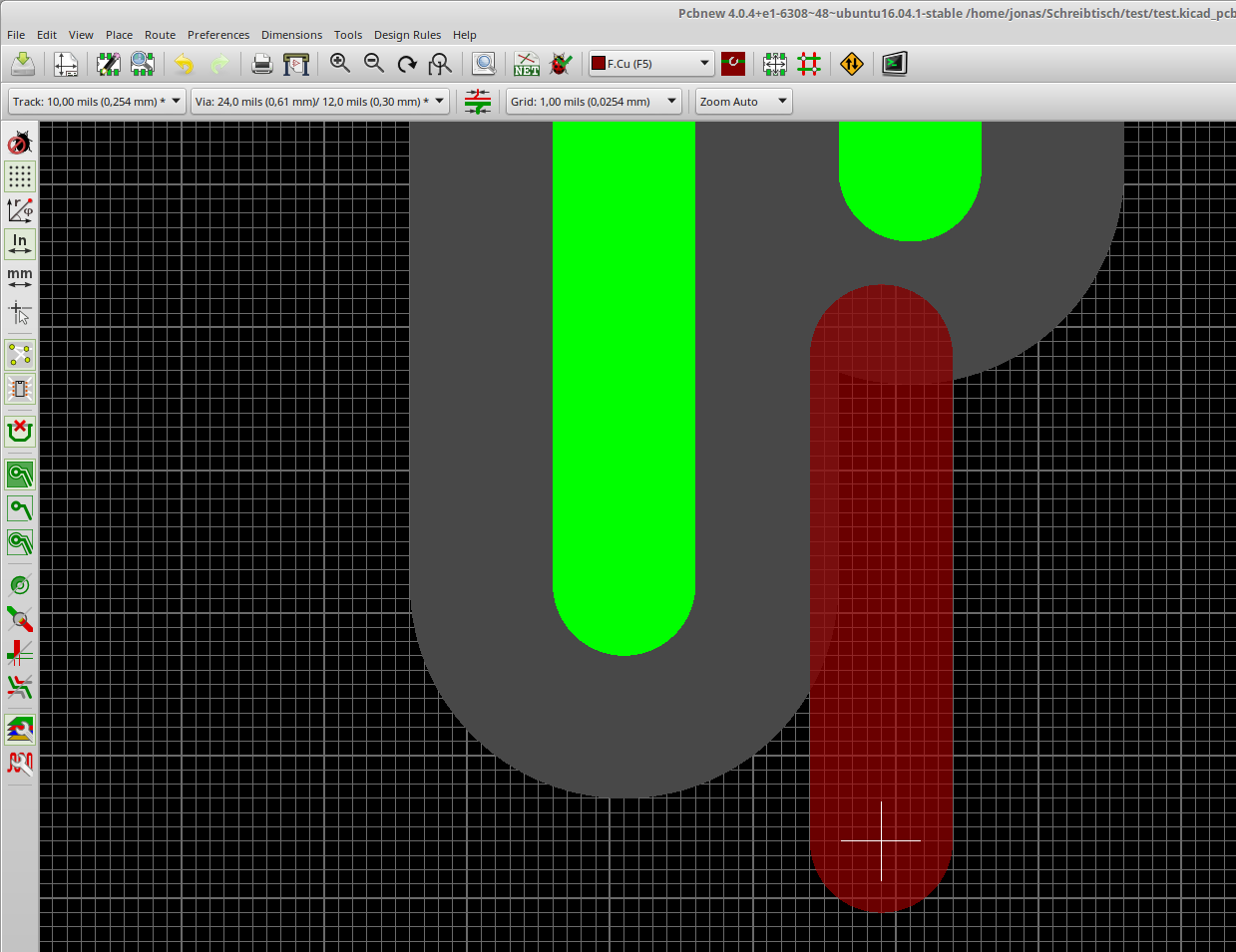 Hallo, ich habe folgendes Problem in KiCad: Ich möchte zwei Leiterbahnen mit einer Clearance von 8 mil platzieren. Die Leiterbahnen sind 10 mil breit. Unter Design Rules habe ich die Clearance auf 8 mil gestellt. Das Raster steht zum testen auf 1 mil. Wenn ich nun im OpenGL Modus versuche die Leiterbahnen zu platzieren geht das erst ab 10 mil Clearance. Im Default Modus geht es auch mit 8 mil. Der DRC meckert bei 8 mil in beiden Modi nicht. Gerade noch ein bisschen weiter getestet, anscheinend geht in OpenGL ein Clearance kleiner als 10 mil nicht unabhängig vom eingestellten Wert. Hast du Bernd oder jemand anders irgendeine Idee was da los ist? Im Anhang ein paar Fotos und das Testprojekt. Gruß Jonas
