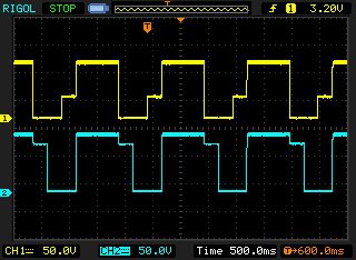 Wenn beide Transistoren aus sind, dann müssten UG1=UG2 ≈ 160V sein, hochohmig gemessen. Ist nur ein Transistor ein, dann wird dem Teiler R2 und R3+R4 nochmals eine Last von 250k parallel gelegt, also müssten am ausgeschalteten Transistor knapp 140V zu sehen sein. Da deine Ansteuersignale sich überlappen, gibt es logischerweise im Überlappungsbereich eine Treppe im Ausgangssignal. Dagegen ist nichts zu machen, außer du stabilisierst die Spannung zwischen R2 und R3, z.B. mit einer Z-Diode und kleinerem R2. Ungewöhnlich ist nur, dass die gelbe Treppe niedriger als die blaue ist und dass (wenn ich das richtig ablese) die Spannungen an G1 und G2 mir etwas zu niedrig erscheinen, ich hätte 160V max und 140V an der Treppe erwartet. Also: irgend etwas ist nicht so dimensioniert wie im Schaltbild angegeben oder du misst tatsächlich zu niederohmig. Letzteres erscheint mir etwas wahrscheinlich, weil ja die gemessenen Spannung niedriger zu sein scheinen.
