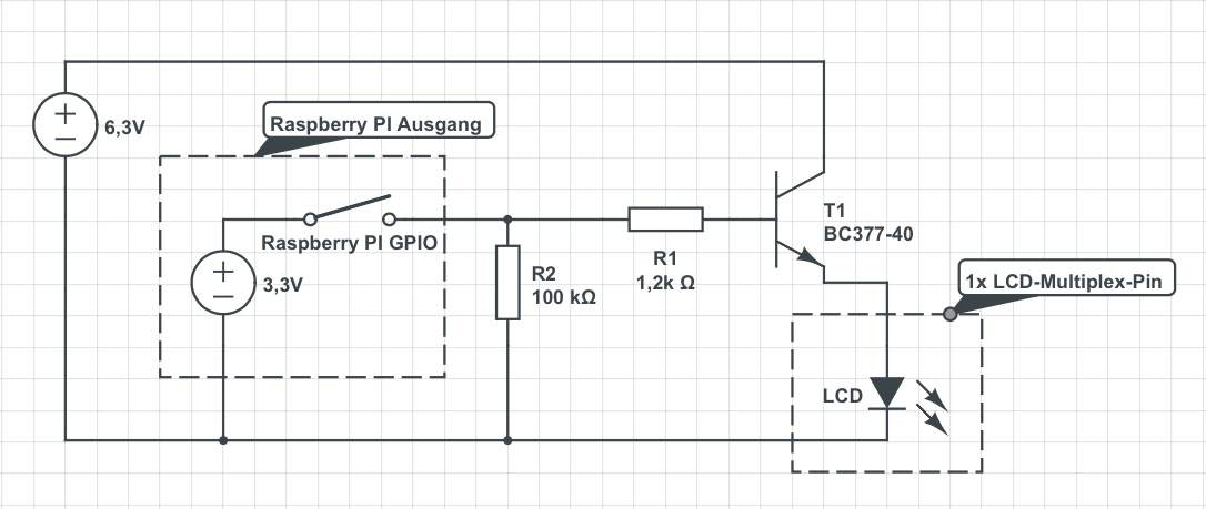 Hallo, ich habe vor mit einem Raspberry PI ein Display eines alten CD-Players anzusteuern. Daten über das Display gibt es kaum. Ich habe jedoch schon experimentiert und folgendes herausgefunden: Das Display funktioniert durch Multiplexen.(siehe Anhang) Es gibt P1-12 und G1-9 Pins also insgesamt 21 Pineingänge. Wenn man P2 und G4 mit einer Spannung von 6,5V versorgt leuchtet z.B. bei der eingebauten 7-Segmentanzeige ein Segment. Zusätzlich benötigt das Display noch eine Versorgung von ca. 3,3V bei ca. 300mA Nun möchte ich mit dem Raspberry PI die P1-P12, G1-9 ansteuern. Da die GPIOs nur 3,3V liefern, dachte ich an einen Transistor, der mir die 6,5V "schaltet". Nun habe ich die Schaltung im Anhang aufgebaut. und folgendes gemessen: Spannung zwischen Kollektor und GND : 6,50V zwischen Kollektor und Basis: 1,98V zwischen Emitter und GND : 4,00V Leider erreicht die Spannung zwischen Emitter und GND nicht die von mir erhofften 6,5V und das Display leuchte nicht. Könnt ihr mir sagen was in der Schaltung falsch ist? Ich muss dazu sagen ich habe bei einem Freund vor 2 Wochen ebenfalls die Schaltung aufgebaut (laut meinen Skizzen zumindest) und da hat es funktioniert. Ich habe im Internet bereits über die von mir aufgebaute Kollektorschaltung recherchiert. Stimmt es, dass bei einer Kollektorschaltung die Emitter-GND Spannung die an der Basis anliegenden Spannung nicht überschreiten kann? Wenn Ja warum erziele ich dann bei meiner Schaltung 4,0V? lg. Sebastian