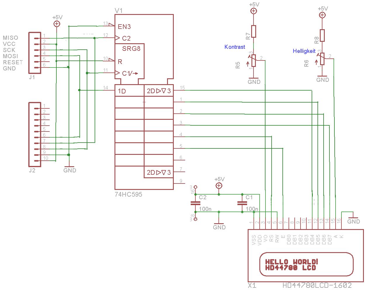 Hi, ich bin noch recht neu in der AVR-Programmierung und habe mir zu Übungszwecken eine kleine Platine erstellt, welche am ISP-Stecker einer AVR-Schaltung eine Debug-Ausgabe auf einem LCD ermöglicht. Ein Versuch der Dokumentation (mittels Fritzing) ist zwar gelungen (Anlage), sieht aber nach meinem Geschmack im Vergleich zu anderen Schaltplänen ziemlich wüst aus. Vielleicht mache ich ja systematisch bei der Erstellung der Zeichnung einen Fehler. Bisher ist meine Vorgehensweise (in Anlehnung an die Anleitungen hier auf der Webseite) die Bauteile von links nach rechts in Eingabe - Verarbeitung - Ausgabe zu sortieren und dann von der Eingabe anfangend die Leitungen zu zeichnen. Für Hinweise zur Verbesserung wäre ich dankbar. LG Matthias