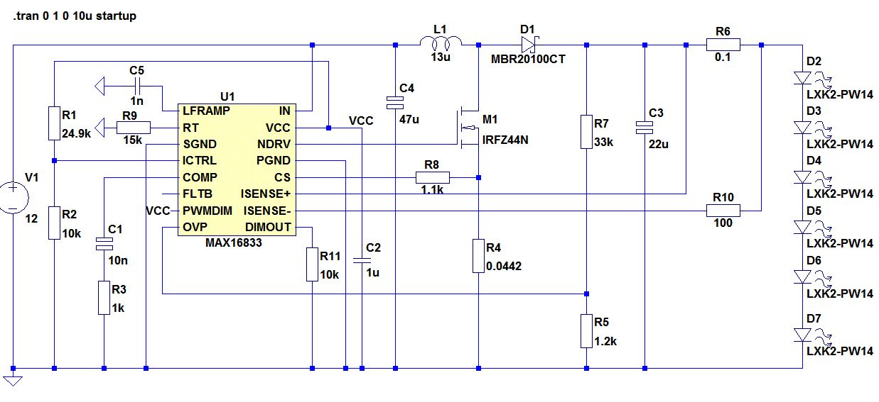 Hallo nochmal und vielen dank! Das hat mich schonmal sehr weiter gebracht. Da ich bei sowas immer Sukzessiv vorgehe wollte ich nun den PWM Eingang "in Betrieb" nehmen um das Signal mit einem µC zu steuern. Bei Vollaussteuerung sollte der PWMDIM min. 1.23 V haben und der von mir eingezeichnete p-Mosfet durchschalten. Leider liegt bei mir am Schaltausgang DIMOUT die Spannung ISENSE+ an (siehe Datenblatt Seite 11). Könnte das ein Fehler im Modell sein? Datenblatt: https://datasheets.maximintegrated.com/en/ds/MAX16833-MAX16833G.pdf Viele Grüße