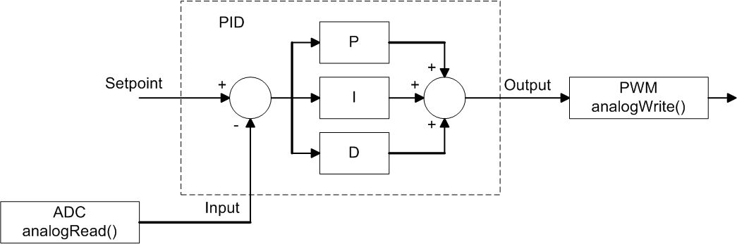 @Karl-alfred Römer (karl-alfred_roemer) >gibt es ein Code Beispiel, in dem PID-Regelung scheinbar ohne Feedback, >also Open-Loop verwendet wird. Das Beispiel ist maximaler Unsinn und wahrscheinlich auch nie getestet, nur einfach hingeschrieben. > Macht das überhaupt Sinn? Nein! >Hier der Link zum Beispiel-Code: >http://playground.arduino.cc/Code/PIDLibaryBasicExample Die Knalltüten hätten einen Servo nehmen sollen, dort kann man die Soll- und Ist-Position schön über einen Poti darstellen (einer am Servo, einer vom Menschen bedient). Das vermukste Beispiel sieht so aus, siehe Anhang. Das KANN nicht funktionieren, schon gar nicht mit I-Anteil!