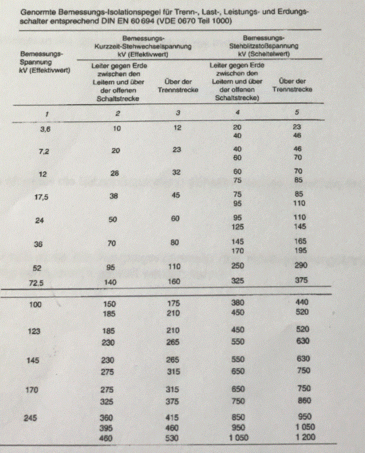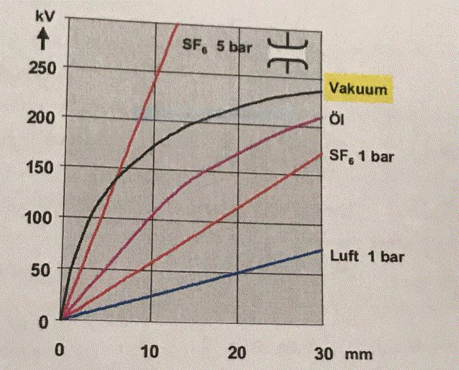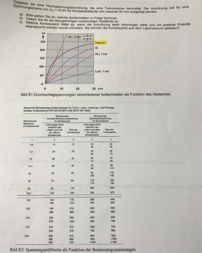 Nachsatz: Dein Scan ist leider schlecht lesbar. Was ich noch entziffern kann, ist der nach DIN genormten Bemessungspegel von 60kV bei einem Um von 24kV via Trennstrecke und daher für Antwort a.) und b.) relevant. Mit einem horizontalen Strich bei 60kV auf- und die Schnittpunkte mit den "Kurven" vertikal auf die x-Achse übertragen kannst Du je nach Isolationsmedium die Durchschlagsspannungen ermitteln.Bei Vakuum wäre schon ab ca. 4mm Ruhe, während die Luftstrecke (bei einem bar) schon bei über 22mm liegen müsste.