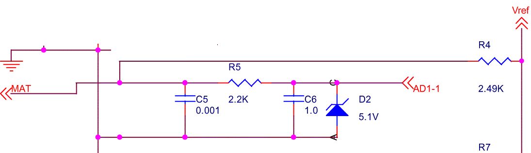 Hallo, vielen Dank für eure zahlreichen Infos, da habe ich wieder was gelernt, bzw muß auch wieder erkennen wie kompliziert die Elektronik (für einen Maschinenbauer/Verfahrenstechniker) ist. @Profi: ja sind statische Temperaturmessungen an einem Motor. Danke, jetzt weiß ich auch wozu C5 (0,001µF) und C6 (1µF) gut sind. @Marin Schneider und buz11 und Christoph Kessler: ein Freund hat mir eine Formel für die gemessene Spannung aufgeschrieben: U_mess = Vref * Ri / ( R4 * ( 1 + ( R5 + Ri ) / RT ) ) RT = ~47Ohm(160°C)...2500Ohm(20°C)...~9400Ohm(-10°C) Wir wussten damals nicht wie groß Ri ist, also der Grund meiner Anfrage hier. :) Ich kann ja nichteinmal ausrechnen wir groß/klein der Gesamtwiderstand ist wenn ich mir vorstelle Ri sei unendlich. @Michael: danke, die Messidee dieser AD-Wandler mit dem Herantasten und Vergleichen habe ich 'verstanden'. Ich würde mich nicht wundern, wenn Ri in Verbindung mit den Kondensatoren 'unendlich', also zu vernachlässigen wäre. Leider habe ich diese Info noch nicht gefunden. Ich habe die Messchaltung aus dem Schaltplan herausgeschnitten und anghängt. Wirklich präzise ist das nicht, nur möchte ich den Fehler in der Berechnung so gering wie möglich halten, dass bei meinem LM7805 nicht genau 5,000V rauskommen habe ich schon bemerkt, durch die 8bit-Auflösung ist die Ungenauigkeit sowieso schon 'eingebaut'. lg »Horst