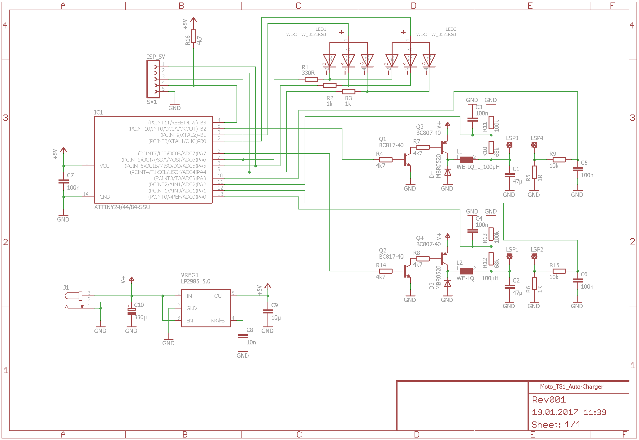 Hallo liebe Leser, vor einiger Zeit habe ich mir einen Satz PMR-Funken T81 Extreme von Motorola zugelegt. Mit den Teilen bin ich für meine Anbwendungen voll zufrieden. Die mitgelieferten Ladegeräte mit je 2 Ladeschalen sind allerdings etwas old-school und besitzen weder eine Abschaltung noch eine Anzeige dafür, wenn die Akkus voll geladen sind. Das war mir zu wenig und so habe ich mich daran gemacht, die originale "Ladeschaltung", die aus 2 60mA-Konstantstromquellen besteht, durch etwas mehr Intelligenz zu ersetzen. Herausgekommen ist eine Schaltung, die in das originale Ladegerät passt (nur kleine Modifikationen am Kunststoff-Innenleben nötig) und mit dem originalen Stecker-Schaltnetzteil verwendet werden kann. Die Features sind im Moment: - Einzelschachtüberwachung - Automatischer Ladestart beim Einsetzen des Funkgerätes in den Ladeschacht - Δ-U Abschaltautomatik mit Timer, Konstantstromladung - Kennzeichnung des jeweiligen Ladezustands mit 1 RGB-LED pro Ladeschacht (rot: Slot leer, blau: Laden, grün: Akku voll - Ladestrom 100mA statt 60mA original, schnelleres Aufladen bei besserer Ausnutzung des Steckernetzteils - Schaltreglerprinzip anstelle Linearkonstantstromquelle, besserer Wirkungsgrad - Echtzeitdebugging über MOSI-Pin (proprietäres Protokoll), default abgeschaltet Als Rechen- und Messknecht kommt ein Tiny44A zum Einsatz, der genügend Speicherreserven für künftige Erweiterungen bietet. Ein Tiny24A oder -84A kann ebenfalls verwendet werden. Die Weichware ist in ASM und momentan noch recht rudimentär (weil ich das Zeug gerade dringend brauche). Weitere Fotos und Doku folgen.