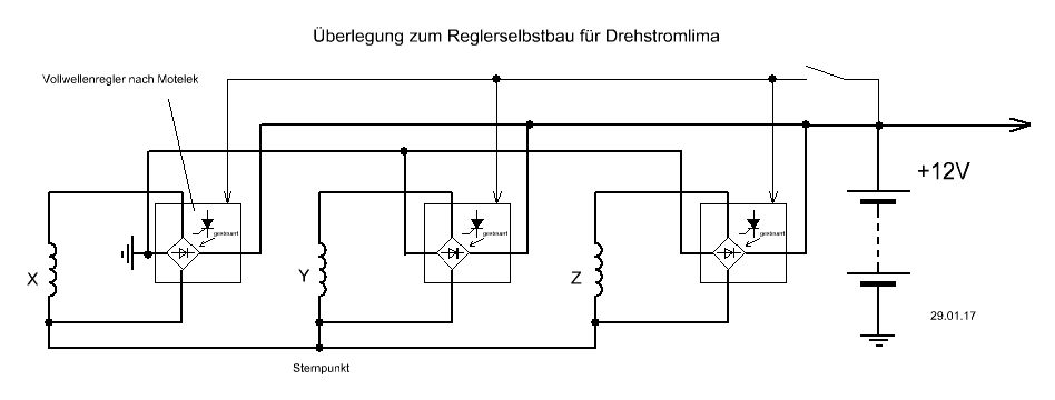 Andreas M. schrieb: > juergen schrieb: >> Jens schrieb: >>> Warum akzeptiert ihr nicht, dass der TO einen anderen Weg gehen >>> möchte. >>> Ihr versucht ständig die bekannte Lösung überzustülpen. >>> >> >> Wenn T0 schlau ist, dann ist er noch in der Entscheidungsfindung. >> Dafür braucht es nun mal seine Zeit. > > Eigentlich hatte ich mein Konzeptidee /Optimierung über Board geworfen, > da mir gezeigt wurde das es so mit einem DC/DC Wandler bzw. Verbraucher > direkt an Lima nicht funktionieren kann. Da ich jedoch nun eh eine 2te > Lima außerhalb vom Motorrad zum Experimentieren übrig hab und mich der > Ehrgeiz gepackt hat, konnt ich es einfach nicht verdrängen. Jedoch > kurzfristig hät ich erstmal eine sichere und einfache Lösung verbaut, > bis vll iwann mal a Lösungansatz (der sicher funktioniert) gefunden > wäre. Für kurfristig Aufbau hät ich eigentlich als Laderegler, wie in > einem Thread vorgeschlagen die beiden Schaltungen > (http://www.motelek.net/schema/spannung/drehstrom/g... > & http://www.motelek.net/schema/spannung/feedback-bridge.png) > miteinander verheiratet und... Ich denke mal, Du meinst so was ähnliches wie oben im Bild? Ob das mit den Potentialen so hinkommt, weiß ich aber nicht. Da müßte noch drüber diskutiert werden! Die Spannung wäre nun um 1/Wurzel 3 geringer, was sich aber bei einer Stromquelle nicht soo nachteilig auswirkt, Im Leerlaufbereich kaum spürbar und bei schon etwas höheren Drehzahlen gar nicht mehr. Dafür kann um das 1,73fache mehr an Strom gezogen werden. Bedingung: Zugänglicher Sternpunkt.
