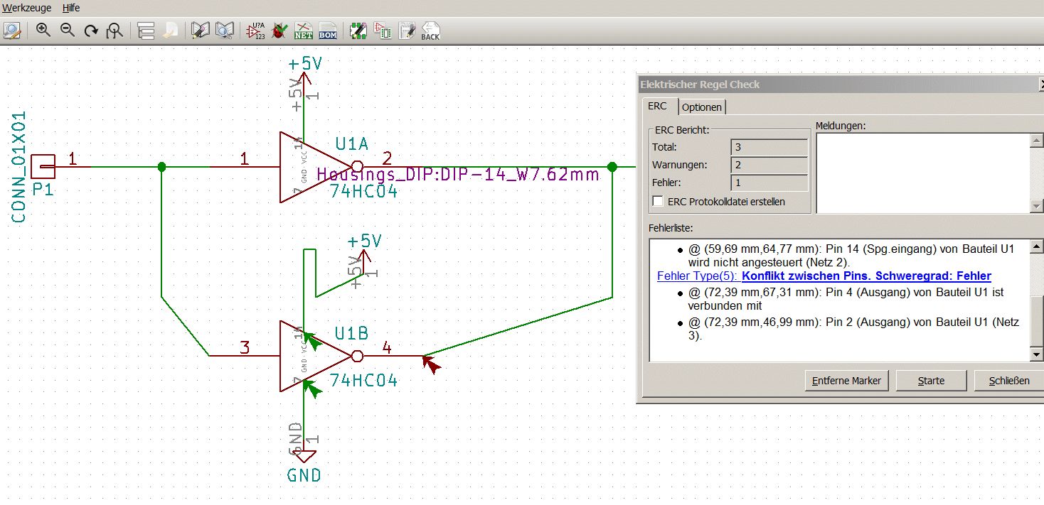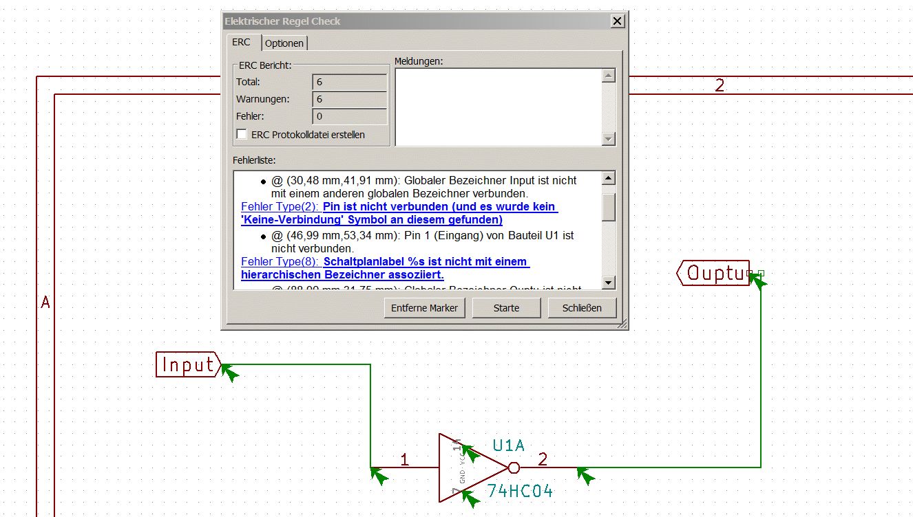 KICAD ist kein Malprogramm sondern ein Programm zum Erstellen von Schaltplänen und Leiterplatten. Deshalb überprüft es die elektrischen Verbindungen, um auf mögliche grobe Fehler hinzuweisen. Es gibt Anschlüsse die z.B. als Eingänge genutzt werden und dort muss irgendein Ausgang angeschlossen sein. Viele haben irgendeine Funktion und dann muss irgendwas angeschlossen sein. Ich habe den Eingang und den Ausgang des Schaltkreises auf einen Steckpfosten gelegt. Siehe da, die Fehlermeldung ist weg. Input und Output sind Bezeichner, nur Namen, diese brauchen auch einen Anschluss ( damit kann man unterschiedliche Blätter des Schaltplanes verbinden. Damit habe ich noch nicht gearbeitet, seht sicherlich was in der Hilfe). Dann muss noch die Betriebspannung des Schaltkreises angeschlossen werden. Die wird anders gezeichnet, um die Übersichtlichkeit des Schaltplanes zu verbessern.