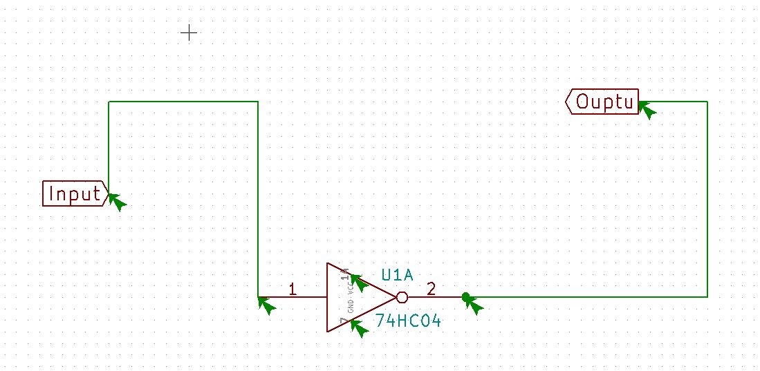 @Genervter Entweder Du trollst, oder Du hast keine Lust gehabt im Netz etwas zu lesen, bzw. Dir mal ein Tutorial anzuschauen... but, so what! Wir wollen niemanden dumm sterben lassen... Das Problem ist, das "Input" und "Output" sind Globale Labels, die kannst Du auf unterschiedlichen Schaltplanseiten nutzen um zum Beispiel das Reset- oder Clocksignal global verteilen! Das Gegenstück sind die Lokalen Labels, die dann nur im aktuellen Schematic Gültigkeit haben. Alle Labels sind aber nicht dazu da, Ein- und Ausgänge auf der Baugruppe bereit zu stellen... Dafür benutzt man Pins, Connectoren, Buchsen etc... Dann wäre da noch das Thema Stromversorgung... dein Gatter braucht eine Spannung, die erhält es über "GND" und "VCC", sprich, du mußt irgentwo ein Bauteil aus der "Power"-Lib auswählen, was "VCC" und "GND" heißt... und dieses noch mit einem Connector oder ähnlichen Verbinden... Aber auch dann meckert der ERC noch... das liegt daran, das jeder Pin eine Eigenschaft besitzt, Stecker, etc. zum Beispiel "Pasiv", das Gatter einen "Eingang" und einen "Ausgang" und die beiden "Bauteile" aus der Power Lib "Spannungs-Eingang" - Ergo will KiCad, das der Spannungseingang mit einem "Spannungs-Ausgang" verbunden wird - entweder man würde an einem "Connector" die Eigenschaften ändern - oder man nutzt die "PWR-Flags"... dort ist als Eigenschaft "Spannungs-Ausgang" gesetzt... und der ERC meckert nicht mehr rum... Das mit dem "PWR-Flag" finde ich persönlich nicht die super Lösung - aber, dafür muss man bei einem Connector nicht wissen, ob er Signale, Versorgungsspannung oder sonst was rein oder raus führt... Die "Anschlüsse" am Gatter kannst die mit dem Button "Versteckte Pins eiblenden", linke Seite, zweiter von unten - ein und ausschalten, die Pins werden dann in Grau dargestellt... ... last but not least - RTFM!