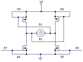 Das sieht ja verlockend einfach aus, könnte bei leichten Anforderungen klappen, wenn genügend Zeit beim Umschalten gelassen wird, da sonst leicht alle 4 Transistoren leitend sein könnten TotZeit beachten). Aber was spricht gegen Fet-Treiber-ICs (IR21xx, HIP408x, ICL7667 etc?) Gib mal Deine Eckdaten bekannt (Spannung, Strom, Frequenz). Ab 2 A lohnt es sich, über aktiven Freilauf und dgl. nachzudenken, dann müssen die Transistoren einzeln geschalten werden. Anbei eine Wertetabelle für den HIP4081: DIS ABHI BLI ALI 1 X X X fast passive decay 0 0 0 0 fast passive decay 0 0 0 1 slow/fast semiactive decay (*) 0 0 1 0 slow/fast semiactive decay (*) 0 0 1 1 slow active decay LoSide 0 1 0 0 slow active decay HiSide 0 1 0 1 fast rise + / fast active decay - (*) 0 1 1 0 fast rise - / fast active decay + (*) 0 1 1 1 slow active decay LoSide (*) depends on current direction Die drei rechten Signale erzeuge ich mit 3 PWM-Kanälen, DIS kommt von einer el. Überstromsicherung. Bei hohen Strömen lohnt sich der Einbau von (Schottky-)Dioden, da die Verlustleistung verteilt wird. Beim Abbremsen kann man zwischen slow decay und fast decay abwechseln, dann wird die Energie zurück in die Versorgung transformiert (Rekuperation, Generatorbetrieb, StepUp-Converter).