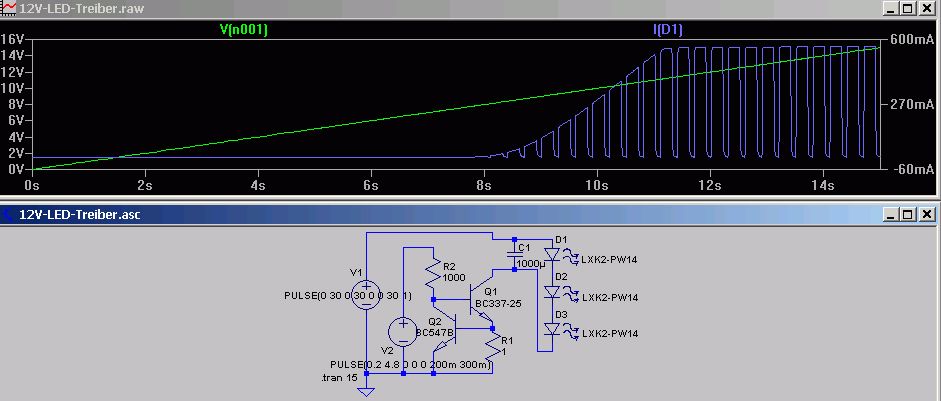 Japp, einen T mehr und man hat schon einen schönen Konstantstromtreiber. V1 simuliert eine ansteigende Betriebsspannung und V2 die PWM. Steuerstrom ist hier unter 5mA bei 500mA LED-Strom