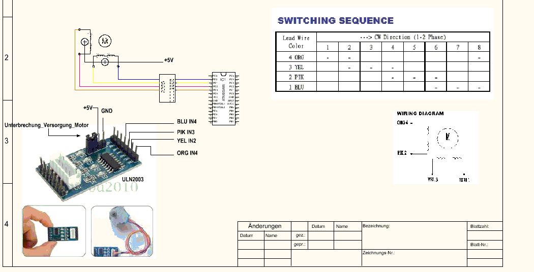 Hallo, ich möchte einen Schrittmotor ganz simpel ansteuern. Um mir einmal etwas richtig darunter vorstellen zu können. Und zwar möchte ich zu nachfolgenden Code anstatt des delays eine Funktion erstellen zb. motorspeed... Um die Geschwindigkeit zu regeln, dazu brauche ich die Startfrequenz und die Maximale Schrittfrequenz. Aber ich habe keine Ahnung wie ich dies umsetzen soll bzw. darauf komme. Denn ich kann mir einfach nichts daruter vorstellen. soweit ich das verstanden habe hängt die Gechwindigkeit von der Geschwindigkeit der Schritt-sequence ab. Und wie ich im Forum Avr- tutorial hier gelesen habe ist das, mit delay zu lösen, der schlechteste fall. Die Frequenz soll wie zb. eine Ladekurve ansteigen? Wie könnte jetzt für nachfolgenden Code eine Lösung aussehen. Im Bild oben eine kleine Übersicht. Ich versorge den Motor momentan mit +5V hier Datenblatt Motor.: [[http://www.raspberrypi-spy.co.uk/wp-content/uploads/2012/07/Stepper-Motor-28BJY-48-Datasheet.pdf]] Datenblatt Treiber.: [[http://www.ti.com/lit/ds/symlink/uln2003a.pdf]] Code.: