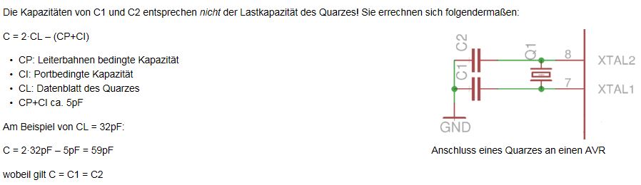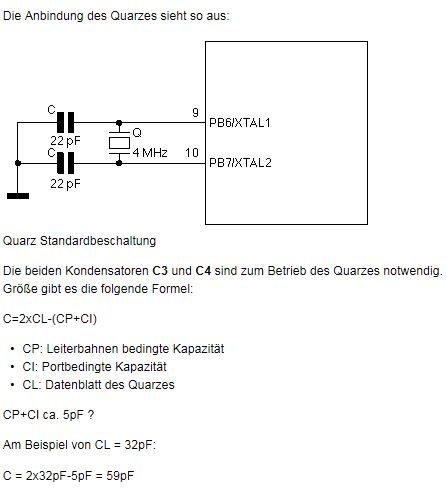 Okay, danke schonmals! dann noch eine Frage, im AVR-Tutorial nehmen die einen Atmega8 und beschalten den mit einem 4MHZ Oszillator...auf den Bildern haben sie aber hinterher einen Quarz mit Kondensatoren... wenn ich jetzt z.b. einen Quarz von reichelt nehme: https://www.reichelt.de/Quarze/4-0000-HC49U-S/3/index.html?ACTION=3&LA=2&ARTICLE=32837&GROUPID=3173&artnr=4%2C0000-HC49U-S&SEARCH=%252A dieser hat CL=20pF C=2xCL-(CP+CI) C=2x20pF-5pF C=35pF also müsste ich um genau zu sein 2 C´s mit jeweils 35pF verschalten,da es diese als Keramikkondensator aber nicht gibt würde ich 33pF oder 39pF nehmen. soweit schonmal richtig? Also könnte ich nicht wie es sonst oft gemacht wird einfach 22pF nehmen oder? Weil hier im µC.net steht im Beitrag: Quarze und AVR, dass man in einem Bereich von +-20% bleiben sollte.
