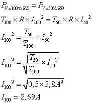 Also ich hab mich damit jetzt noch nie befasst, aber ich würde einfach sagen dass beide Verlustleistungen identisch sein müssen. Also Pv100%ED = Pv50%ED T_100*R*I_100^2 = T_50*R*I_50^2 I_100^2 = (T_50)/(T_100) * I_50 ^2 I_100^2 = SQRT[(T_50)/(T_100) * I_50 ^2] = SQRT (0.5*3.8^2) = 2,69 A