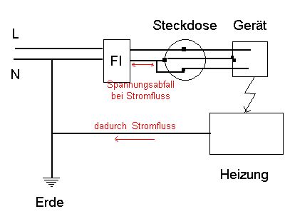 (z.B. über eine Ableitung Mensch Heizung, Wasserrohr)löst den FI aus.