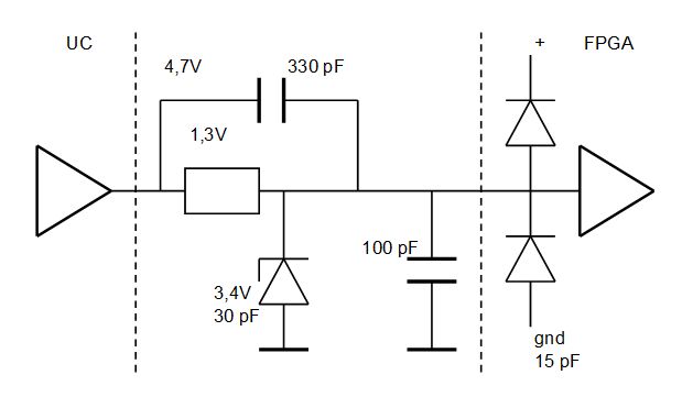 Wir ersetzen eine alte PLD Schaltung durch einen FPGA, der auf 3,3V läuft und keine 5V packt. Angeschlossen ist ein Controller mit 5V Ausgängen und Leitungstreibern. Ich habe zwei schnelle, interne Kommunikations-Leitungen zu verbinden und will dafür keinen Pegelwandler. Ich möchte einen R mit Z-Diode verwenden, vermute aber, daß ich laut Pegelwandler zu langsam sein könnte! Daher habe Ich mir überlegt, eine Kapazität beizuschalten, um schneller zu werden. Die Dimensionierung wäre: 5V-Ausgang (vermutlich maximal 4,7V) über 1000 Ohm an eine Z-Diode mit 3,7Volt, damit rund 1mA Dauerlast und kaum Belastung für die clamp Diode. Der Eingang sieht maximal 3,8V. Durch einen Kondensator von 220pF parallel zu dem R soll der Impuls schnell geleitet werden. Damit es hochfrequent passt, nochmal 330pF parallel zur Z-Diode gegen GND. Das gibt wir bei einem Tastkopf einen Spannungsteiler von 3/5 und erzeugt 3,0V Puls. Gfs auch 220pf, damit die Kapazität der Diode und des Eingangs berücksichtigt werden. Sagen wir insgesamt 300pf.(?) Klappt das? Die kapazitive Last müsste der Ausgang packen.