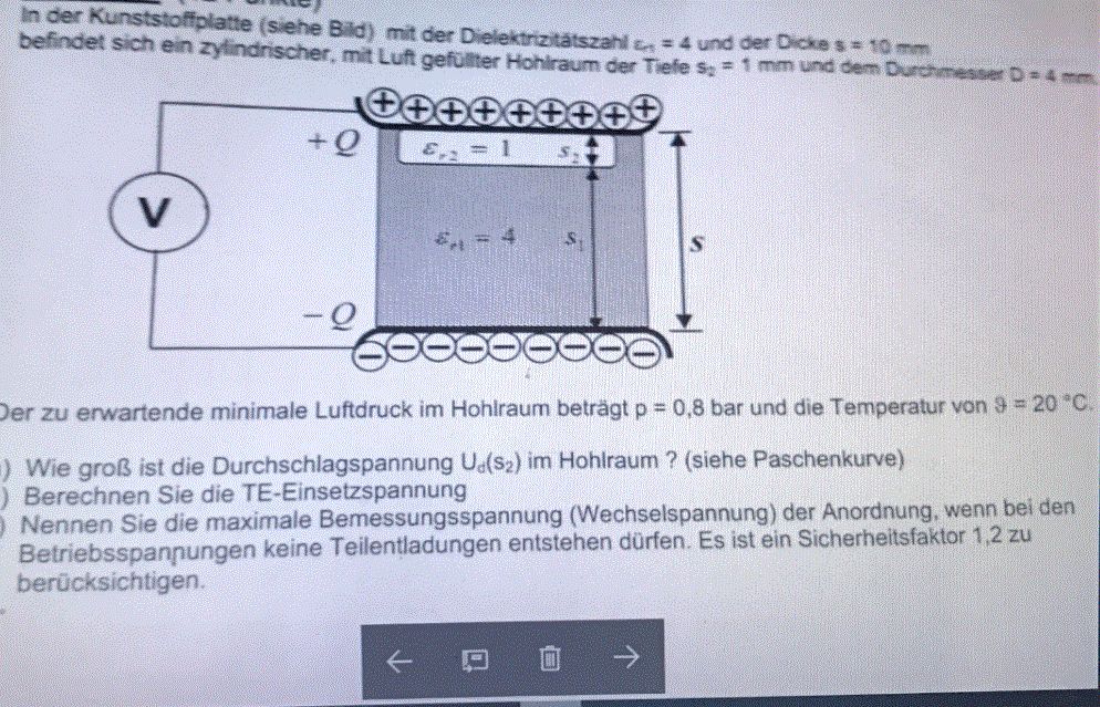 (Klausur Hochspannungstechnik ist schon länger her ...) Überlegungen: 1) Die anliegende Spannung teilt sich ja hälftig am Lufthohlraum und am Kunststoff auf: ε(r) und Strecke im Kunststoff sind viermal so gross wie in Luft. 2) Die Radien des Lufthohlraums bewirken keinen Spitzeneffekt (?) 3) Dann müsste man direkt aus der Paschenkurve ablesen können, dabei den Scheitelfaktor (Wechselspannung), den Sicherheitsfaktor und den verringerten Druck berücksichtigen.