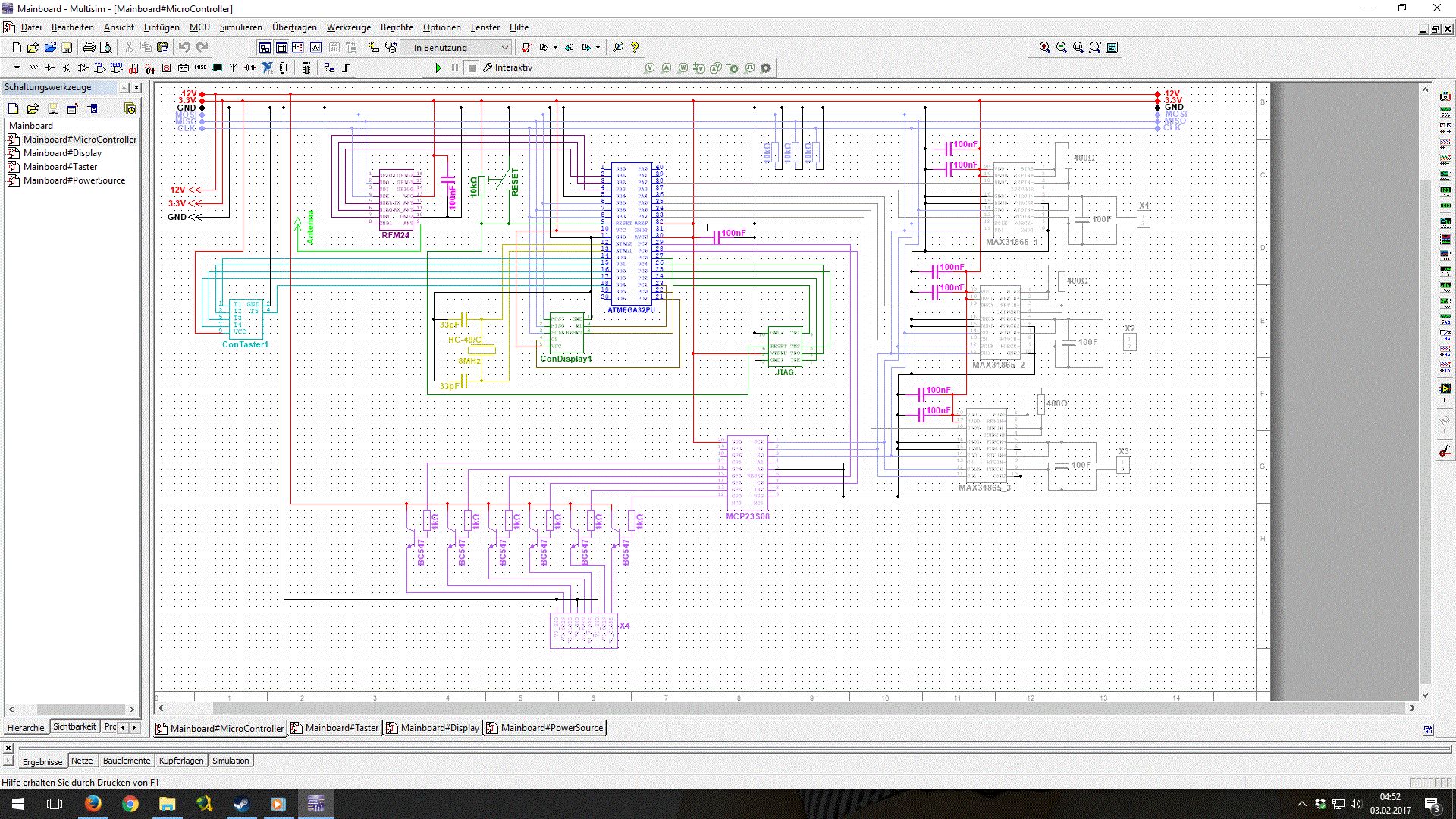 Guten Morgen Matthias S, Das mit der ISR und mit main ist eigentlich nur so, weilich das Programm erst zum laufen bringen wollte. Ich habe auch mit anderen Progammteilen meine Problem. das das Display sich abschaltet und ich den MC jedes mal reseten muss. Aber das der MC garnicht mehr reagiert war bis jetzt nicht der Fall. Ich hjabe dir mal den Schaltplan hoch geladen. Gruß Nutnic