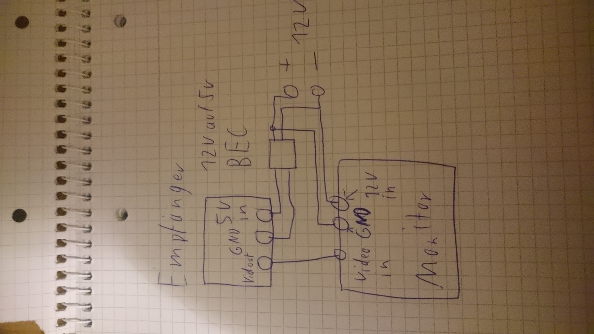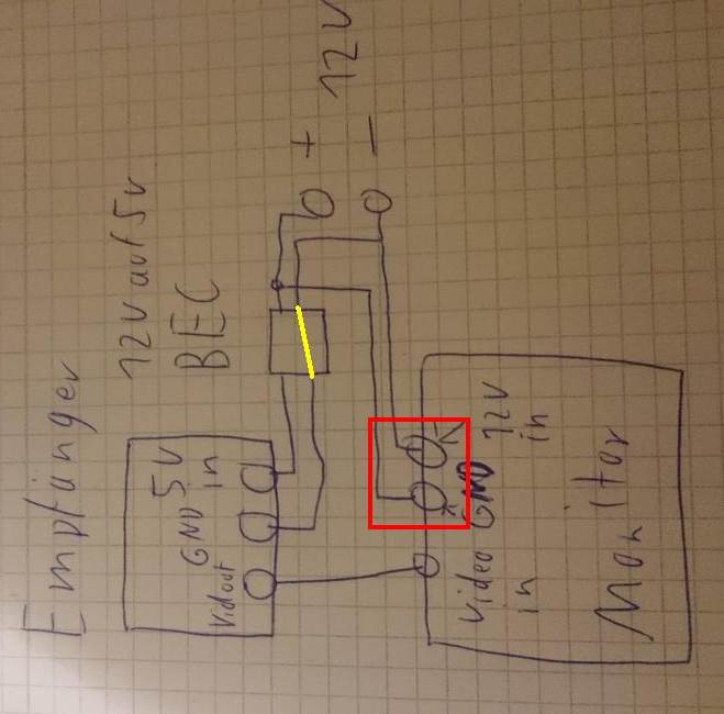 Hallo, Ich bin neu hier aber ich habe eine Frage die mich zum verzweifeln bring. Ich moechte eine 5,8ghz empfaenger an einen Auto Rückfahrmonitor anschliesen. Das problem ist der monitor lauft natürlich ueber 12v der Empfaenger ueber 5v. Soweit kein problem ich setze zwichen der akkuspannung und dem Empfaenger ein BEC ein komme also auf 5v Betriebsspannung. Das Problem ist nun ich habe nur ein Anschluss für den Videoausgang und nur einen Video Anschluss. Jetzt ist meine frage einfach Video Ausgang des Empfaengers mit dem Videoeingang des Monitors verbinden? (Ueber nur ein Kabel fliest ja kein Strom).Oder muss ich noch den GND des Monitors mit dem GND des BEC auf der 5V Seite verbinden.Oder fliest der Strom automatisch wieder ueber den BEC "zurück". Meine Sorge ist dass ich eine Potientialunterschied der beiden GND's habe. Ich habs mal versucht "fachmännisch" aufzumalen. Vielen dank schonmal im voraus!!