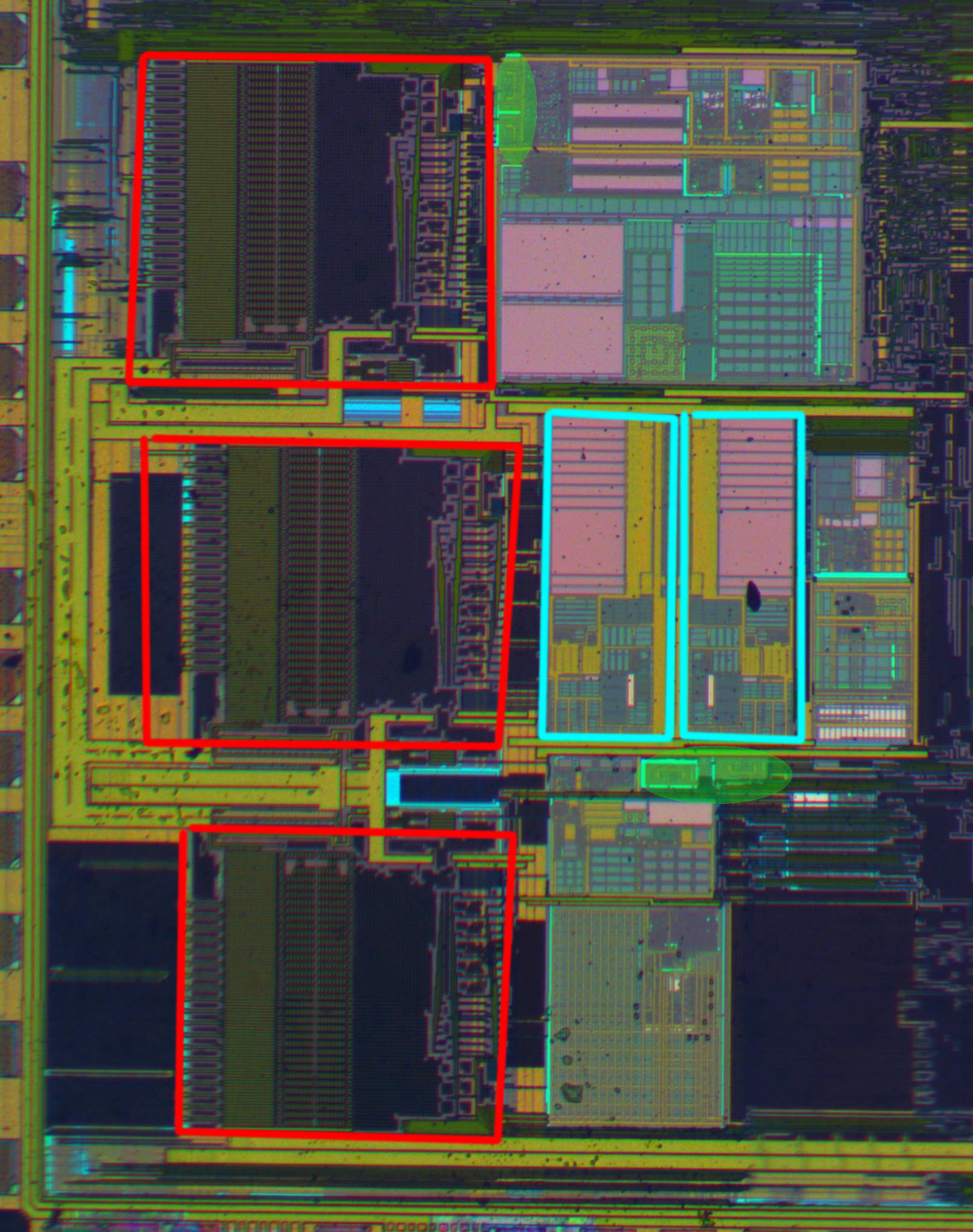 Hallo zusammen, da ich mittlerweile sehr viel mit STM32 arbeite, hat es mich mal interessiert, wie diese Chips intern eigentlich aussehen. Beispielsweise gibt es hier den STM32F103VGT6 zu sehen (Achtung: 6000px*6000px Größe!) https://upload.wikimedia.org/wikipedia/commons/8/89/STM32F103VGT6-HD.jpg Hier noch ein anderer (STM32F100C4T6): https://upload.wikimedia.org/wikipedia/commons/thumb/6/67/STM32F100C4T6B-HD.jpg/1024px-STM32F100C4T6B-HD.jpg Welche Funktion erfüllen die einzelnen Blöcke aber? Ein bisschen was hab ich schon herausgefunden (jetzt auf den STM32F103 bezogen): - Links und rechts ist mittig jeweils in SRAM Block. (typische Struktur) - Oben und unten sind zwei Bänke Flash - Zentral in der Mitte ist der Core - Rot eingezeichnet sind die 3 ADCs (siehe Anhang) - Hellblau eingezeichnet sind die 2 DACs (siehe Anhang). (ADC+DAC vermute ich anhand der Anzahl, ich habe die Bilder mit dem Datenblatt verglichen) Die anderen Blöcke im Anhang sind mir noch unbekannt. Insbesondere das grün markierte finde ich interessant. Diese U-förmige Struktur sehe ich öfters. Neben dem Flash (nur im Gesamtbild zu sehen!) tritt sie sogar 3 mal auf. Mittig unten (im Anhang) befindet sich auch noch eine gitterförmige Struktur von Leiterbahnen. Usw. usw... Eventuell gibts hier ja jemanden, der hier ein paar Tipps geben kann! :-)