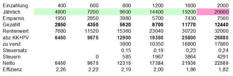 Sowas Ähnliches hat mir der Rüruppberater auch vorgerechnet: Man spart sich als Selbständiger nur soviele Rentenbeiträge an, wie man später steuerfrei bekommen kann. Damit kann man den Steuervorteil heute effektiv nutzen. Bei mir sind es etwa 650,- die Ich im Monat anspare, bei etwa 1100,- Auszahlung später. Bei den anstehnden Freibeträgen von etwa 9000,- hat man damit keine nenneswerten Einnahmen, nach Krankenkasse, die man ja abziehen kann. Eingespart werden damit etwa 300,- Euro netto im Monat. Die legt man sich zu den etwa 500,- zusätzlich nebenhin, weil die 1100,- in 20 Jahren, wenn Ich in Rente gehe, garantiert nicht zum Leben reichen.