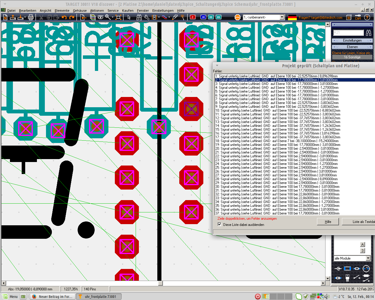 Ich verzweifle langsam. Wie im Bild zusehn, zeigt mir die Prüfung tonnenweise "Signal unfertig". Die Verbindungen sind aber korrekt verbunden. Habe bereits versucht: -Leitungen gelöscht und neu gezeichnet. -Mit riesiger Vergrösserung die Leitungen an die Pins gesetzt. -Target geschlossen und wieder geöffnet. Weiss jemand Rat? PS: Ich weiss, DipTrace wäre viel komfortabler zum arbeiten. Leider ist mir die Bibliothek zu klein und es schafft das Linux-Isolationsfräsen nicht (wie auch Eagle, KiCAD usw.....zumindest nicht bei mir).