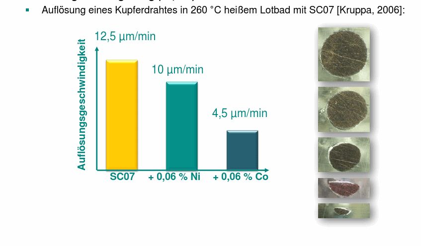 Moritz schrieb: > mit Zinn und etwas Kuper. Oder mit etwas Silber. Oder mit etwas Nickel. > Sogar mit Germanium habe ich es schon gesehen. Warum? Bild 1 im Anhang, SC07 = SnCu0.7 (also eher in Richtung reines Zinn) angucken was mit dem Kupfer passiert. aus elsold 'Auswahlkriterien für Lotlegierungen' > Und warum gibt es auch so viele Mischungsverhältnisse? Das Eutektikum Eigentlich ist es wohl immer nur das Zinn welches die direkte Verbindung zu den Oberflächen eingeht, Blei z.B. findet sich nur im Füllbereich wieder. Jetzt gibt es halt schmale und weite Spalte, kurze und lange und das auch wiederum zwischen Kupfer, Messing, Silber, Gold, ... Und jetzt will man ein mal ein duennes Stahlblech oder ein Stück Alu ... Das hier ist doch recht anschaulich, http://www.ersa-shop.com/additional_files/pdf/Grundlagen%20der%20Handl%F6ttechnik%20in%20der%20Elektronik.pdf