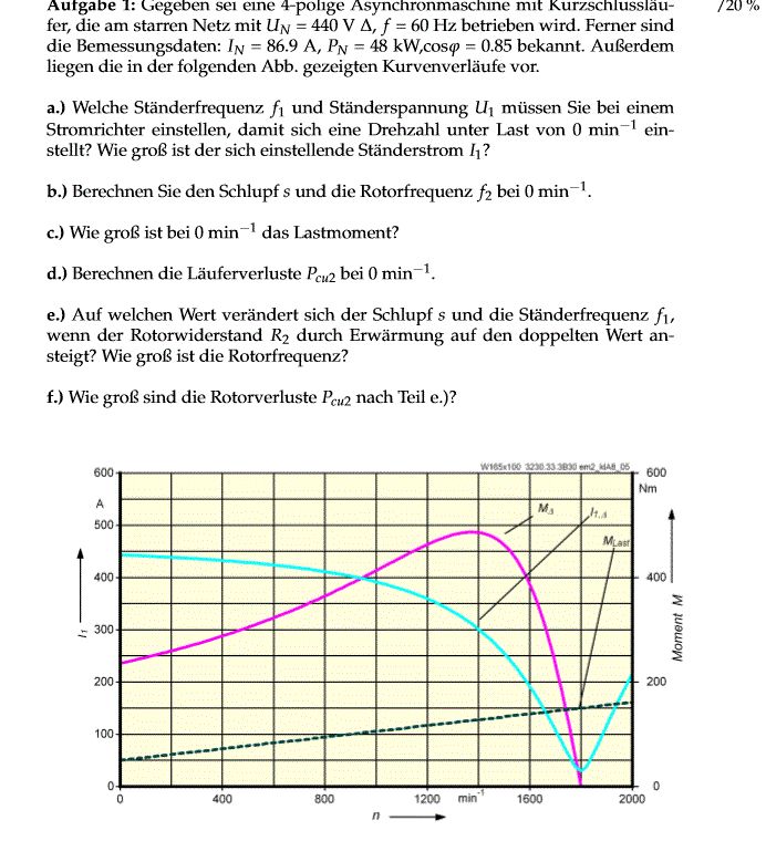 Ich habe es jetzt fast ausgerechnet : In = 86,9A Lastkurve hoch geschoben zur Drehzahl n= 1715 f1= (1800-1715)/(60)=2.83Hz U1 = 440V*2,83Hz/(60Hz)= 20,75V I1 = 4,09A b) S1 =1 f2=f1 = 2,83Hz c)Mlast = 50Nm d) Läuferverluste: Pcu= 240Nm*1*2*pi*2.83HZ =4267,5W e) doppelter Wert wäre ja: 2*f1 = 2*2,83 = 5,66 s= 2 f)Wie komme ich auf die Rotorverluste?