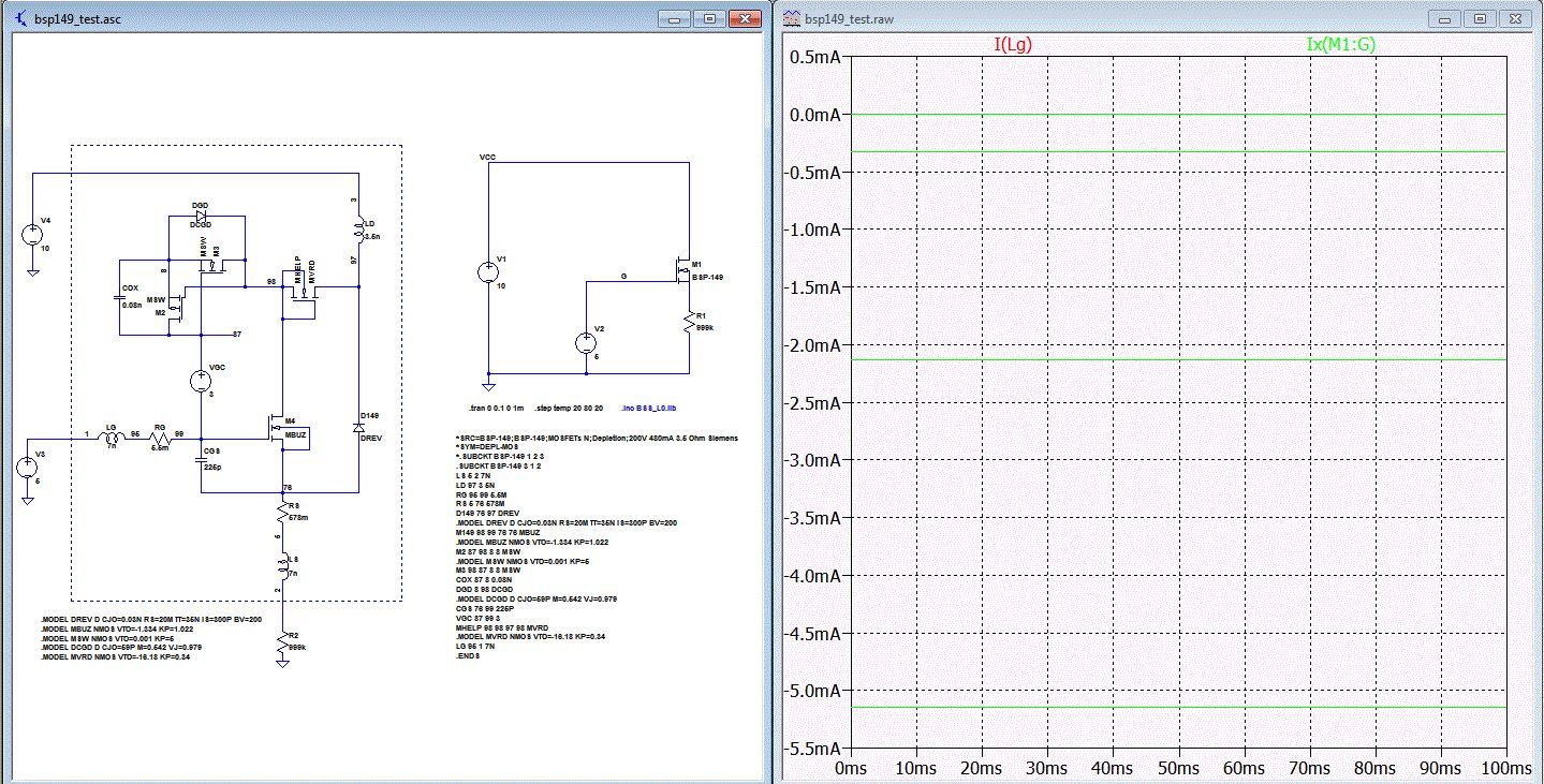 Hallo Olaf, ich habe mal die Schaltung des Subcircuits gezeichnet. Das ist die Schaltung auf der linken Seite. Hatte aber dann keine Zeit mehr das näher zu untersuchen. Fests steht die haben eine Ersatzschaltung zwischen Gate und Drain eingebaut die Cgd(Udg) nachbilden soll. Die ist leider DC-gekoppelt und führt dazu, dass da DC-Gatestrom fließt. Ich kann mich erinnern, dass in einem Mosfetmodell eines anderen Herstellers dort eine ähnliche Schaltung war aber zusätzlich ein Koppel-C eingefügt war. LTspice bietet für Power-Mosfets das VDMOS-Modell an. Mit dem benötigt man kein Subcircuit mehr um einen Power-Mosfet richtig zu simulieren. Gruß Helmut Nachtrag: Im Schaltplan links sollte M4 besser M149 heißen, damit der Name dem im Subcircuit entspricht. Das hat aber keine Auswirkung auf die Simulation.