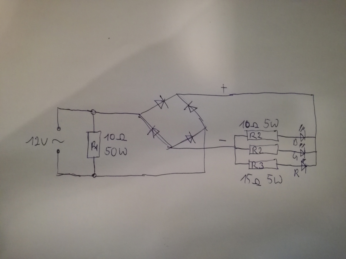 Hallo Leute Habe die im Anhang gezeigte Schaltung aufgebaut und verzweifle daran. Ich will eine 10W RGB LED an 230V betreiben und das in einer engen Röhre. Also habe ich mir einen elektrischen Trafo geholt schön klein 10W-60W. Leider spricht der aber nicht auf meine 10W LED an. Was mich gar nicht so sehr wundert. Also habe ich Parallel einen 10 Ohm Widerstand gesetzt das der erst mal die 10W verbrät. Mit 50W dachte ich ausreichend dimensioniert. Das goldene Aluminiummonster wird aber ganz schön warm. Komischerweise aber erst mit Gleichrichter parallel. Das eigentliche Problem ist aber der Gleichrichter. Der schmilzt mir fast obwohl für 3,7A ausgelegt.Nach meiner Rechnung fließen hier nur 3X300mA ind den LED´s und jeweils etwa 250mA in den Vorwiderständen. Ergibt 1,6A. Habe auch ein längeres Stück Aluminium draufgeklebt. Bringt was aber nicht sooo viel. Habe ich einen Denkfehler? Was kann ich anders machen. Habe mal versucht anstatt dem großen 10 Ohm Widerstand 20 Ohm Wiederstand zu nehmen. Dann wird wenigstens der "Verbräter nicht so warm. Aber der Gleichrichter schon. Hilfe! Gruß Uli Ach ja. 10W RGB deshalb weil irgendwann noch eine Funk RGB Steuerung dazu kommt. Die Lampen sollen aber erst mal so leuchten.