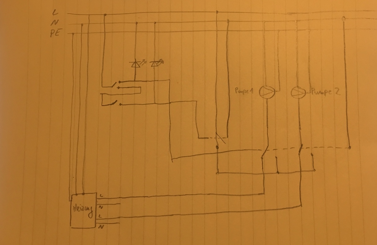 Moin liebe Gemeinde. Ich habe eine Frage zu angehängter Schaltung. Zunächst möchte ich den Zweck erklären damit der Aufbau etwas verständlicher wird. In dem Haus in welchem die Schaltung installiert ist gibt es eine Ölheizung und einen wasserführenden Ofen. Wenn der Ofen angefeuert ist sollen beide Umwälzpumpen (Warmwasser und Heizung) dauerhaft laufen. Allerdings soll es in diesem Fall möglich sein beide Pumpen abzuschalten falls sie nicht mehr benötigt werden. Im Ölbetrieb soll die Steuerung von der Ölheizung übernommen werden. Das ganze wurde mit 2 Relais gebaut, ein Schließer und ein Doppel-Wechsler. Diese werden von 2 Schaltern gesteuert die an einem gut zugänglichen Ort im Wohnbereich angebracht sind. Zur Kontrolle sind 2x 230V LEDs angebaut worden die den Schaltzustand anzeigen. Das alles funktioniert genau so wie es soll. Problem dabei: Die LED für den Holzbetrieb funktioniert ganz normal, die LED für den Heizungsbetrieb leuchtet im "inaktiven" Zustand ganz leicht nach, was sehr leicht falsch interpretiert werden kann. Die Besitzerin hat mich gefragt ob ich eine Idee für eine Lösung habe. Meine erste Vermutung war, dass der Wechsel-Schalter (Eltako ER12 002 UC) diesen Effekt erzeugt, sicher bin ich mir dabei allerdings nicht. Was ich noch nicht testen konnte ist, ob ein Vertauschen der Schaltzustände Abhilfe bringt. Ich bin nicht mehr ganz sicher, aber ich meine der Zustand Holz wäre der mit anliegender Spannung am Steuereingang. Könnte das das Problem lösen? Technisch würde es ja keinen Unterschied machen in welche Richtung geschaltet wird. Kann mir jemand Helfen? Bevor ich mehrfach alles umbaue und keinen Erfolg erziele :-) Vielen Dank schon mal im Voraus! Viele Grüße, Arne
